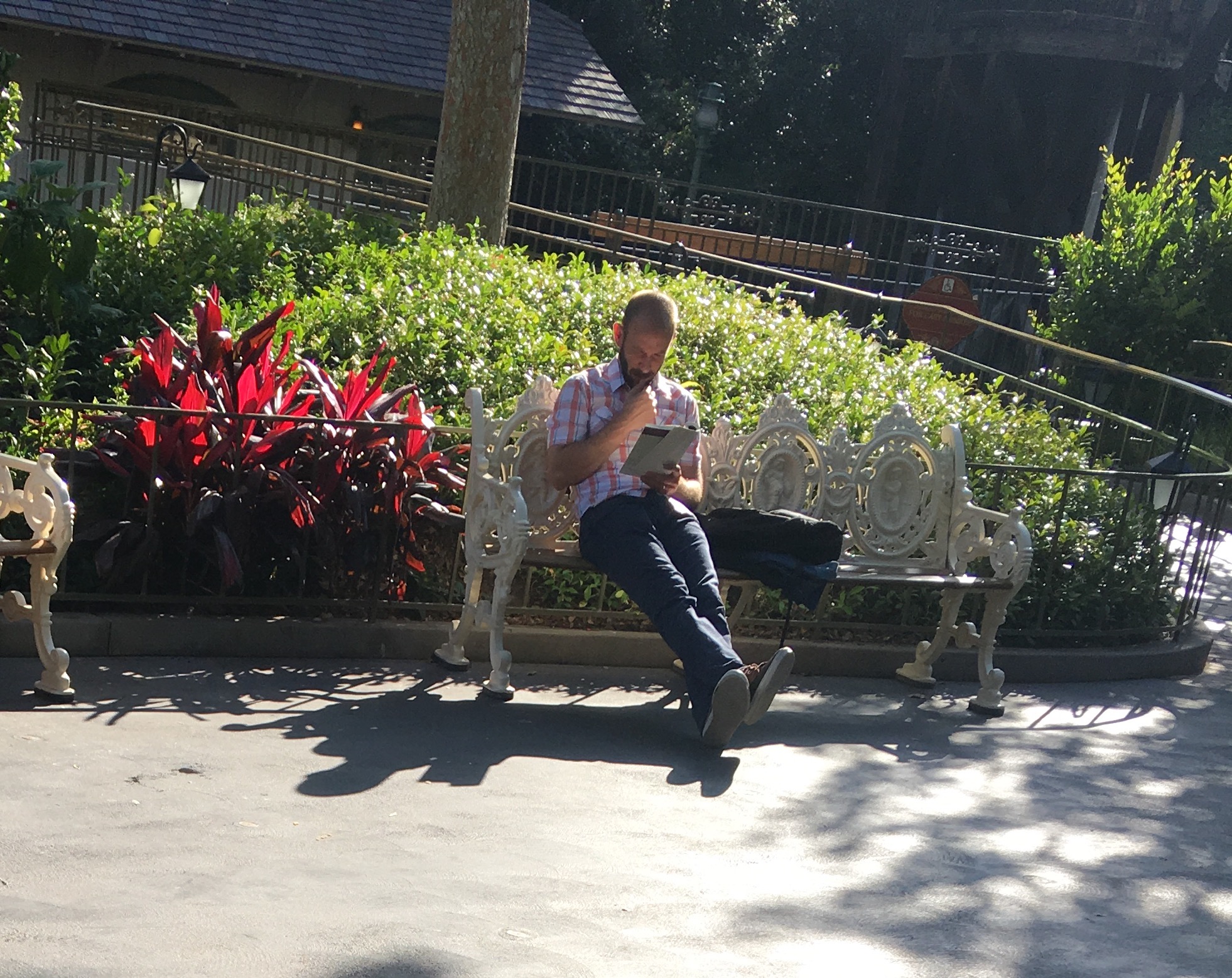 But in terms of finding the most accessible, semi-quiet, location for reading that also boasts good scenery is the area around New Orleans Square Station. Currently, because of the work being done on Star Wars Land, the station is simply a place to tour one of the parked trains which means it isn’t heavily trafficked. From this location, you can view the crowds going into Haunted Mansion and entering Critter Country. You also have good access to food at French Market and you’ll be able to hear the jazz band that plays there intermittently. While I was scouting this location, I spied a fellow reader, Joe, who was enjoying a book from a bench adjacent to the station. Joe told me that this is his favorite place to read from and I’m inclined to agree.