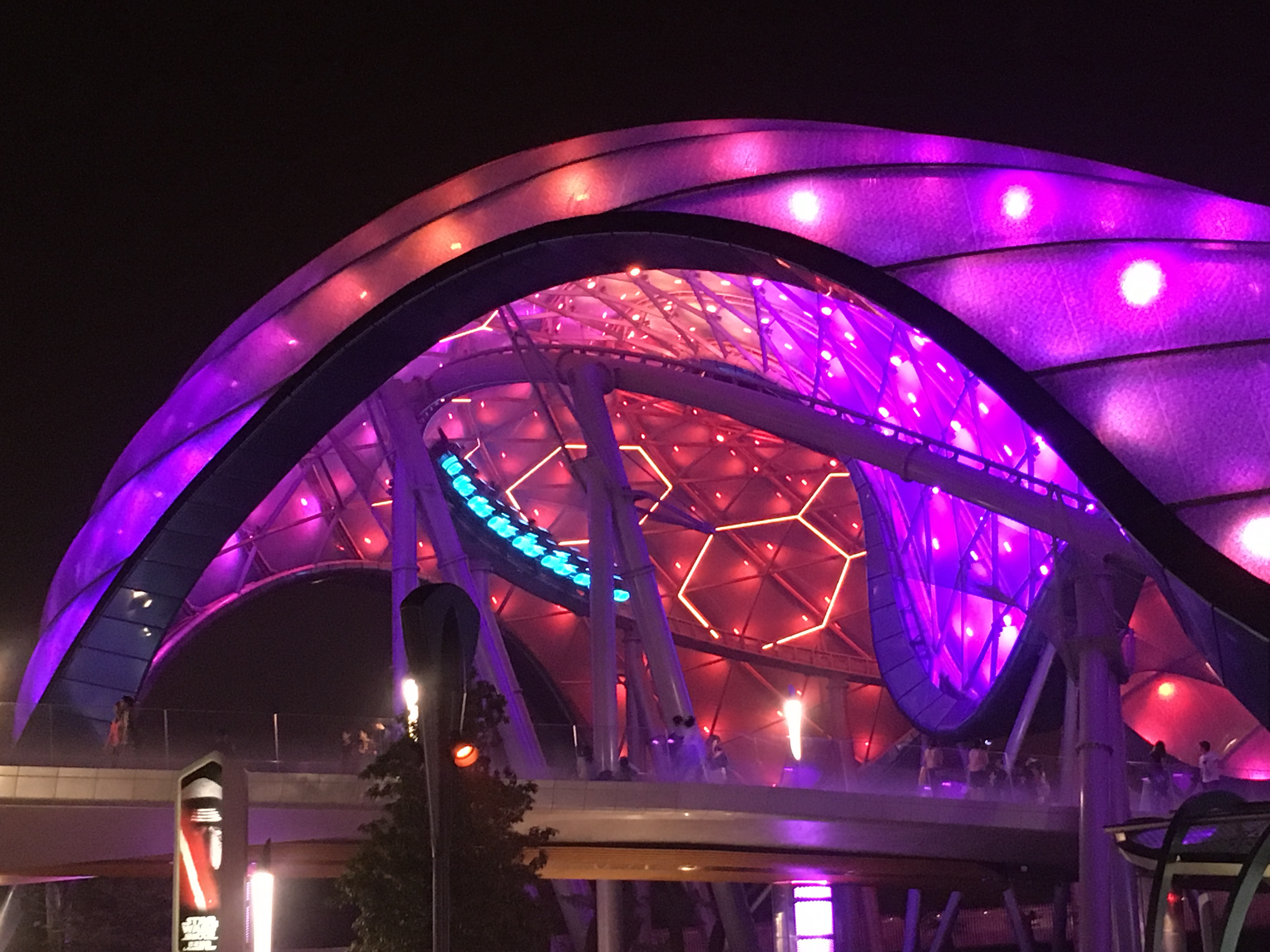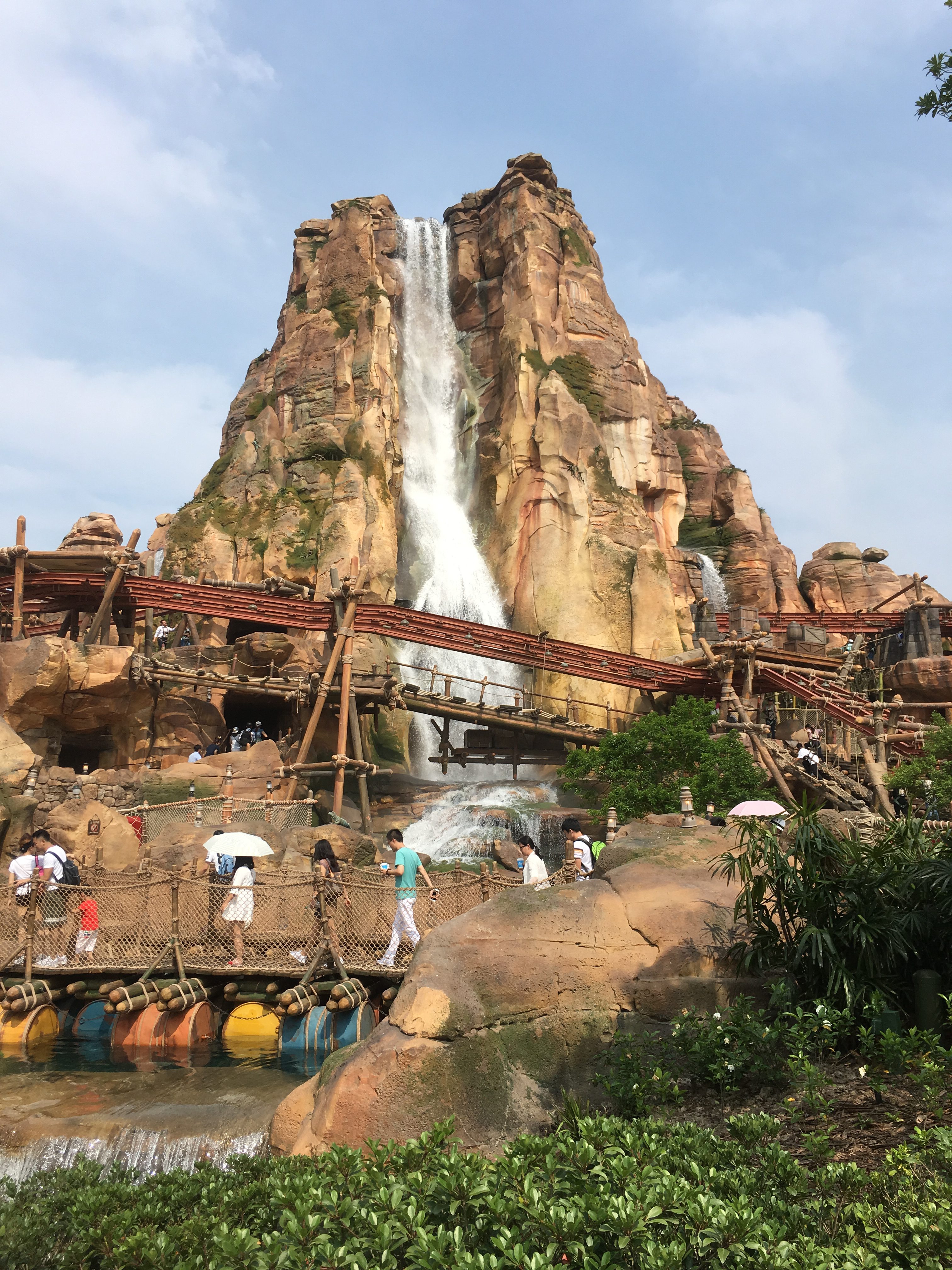 In a twist from most castle parks, Shanghai's Tomorrowland is actually to your left, sitting at about eight o' clock if the castle is 12. If this is the future, the future is bright — literally! One of my favorite things about this park was how beautiful Tomorrowland looks at night with gorgeous blues, pinks, and purples filling the area as trains of lightcycles zip by. Tomorrowland is also wonderfully spacious which is a welcomed changed from the tight, cramped Metro trains of Shanghai. This combination made for a land that was surprisingly soothing considering that it houses the biggest thrill ride in the park.Adventure Isle