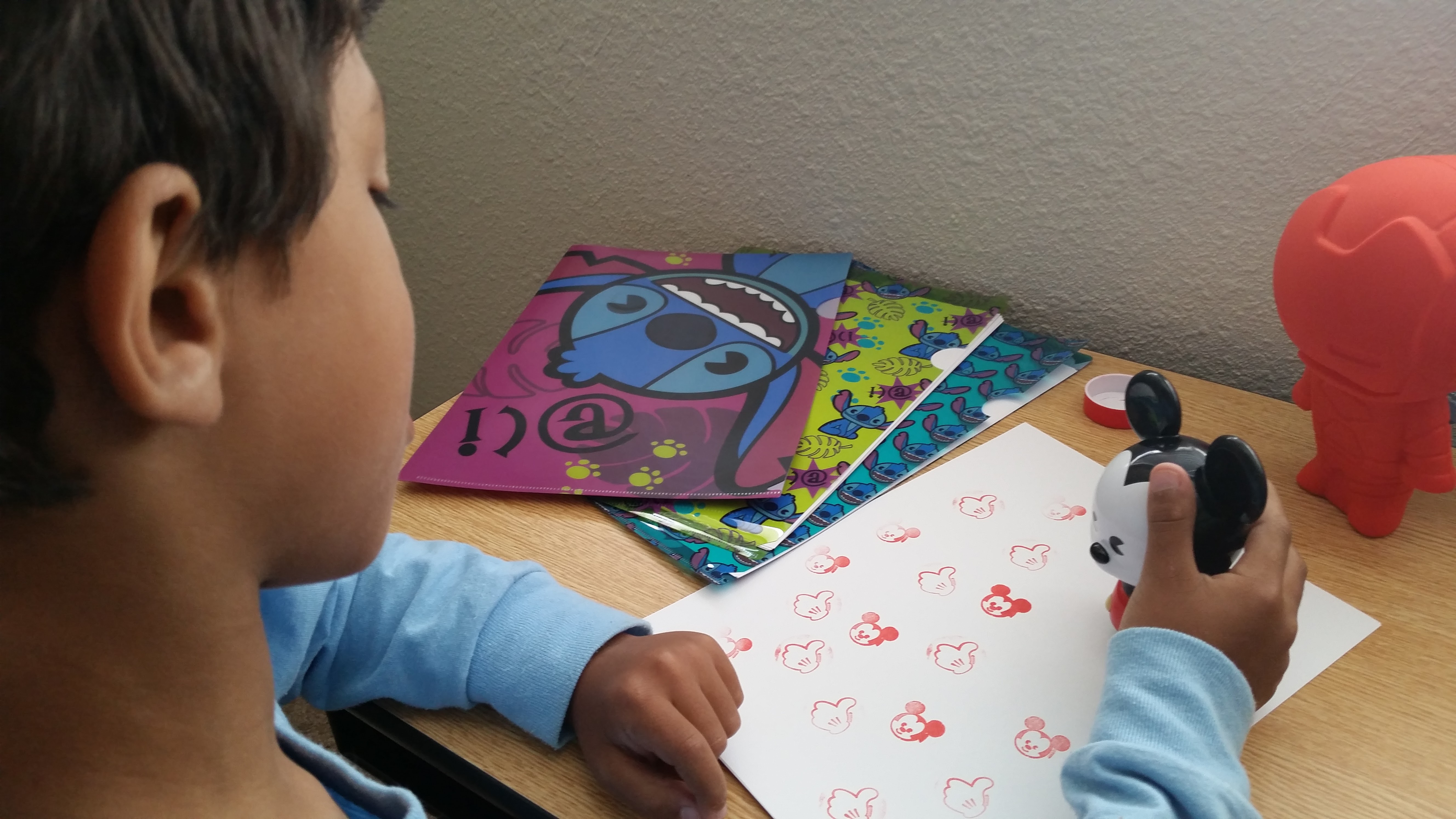 The adorable Mickey Mouse MXYZ figural stamp features two stamp images as does the Captain America one. The images are found on either side of the stamp area which snaps into the area beneath figure’s feet. I was a bit challenged to flip over the stamp image without getting ink on my hands, but it easily wiped off. I can already see Mickey’s “thumbs up” getting a lot of use around here to encourage my little guy’s reading goals or chore accomplishments. Not only is the stamp image adorable but Mickey’s little arms also pop up like a little “hooray” motion, so double-fun with each stamp. Additionally, the stamp base has a cover that requires you to do a simple twist and slide off to access the stamp area so happily you can display the figure without inking the shelf.
