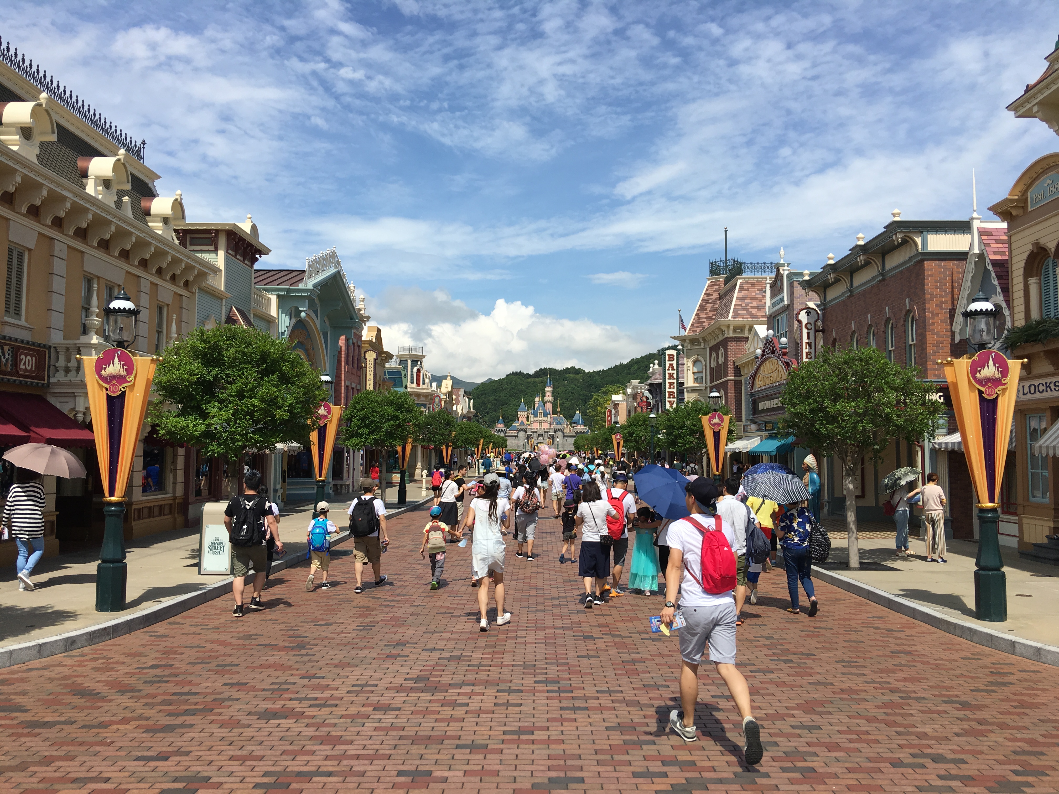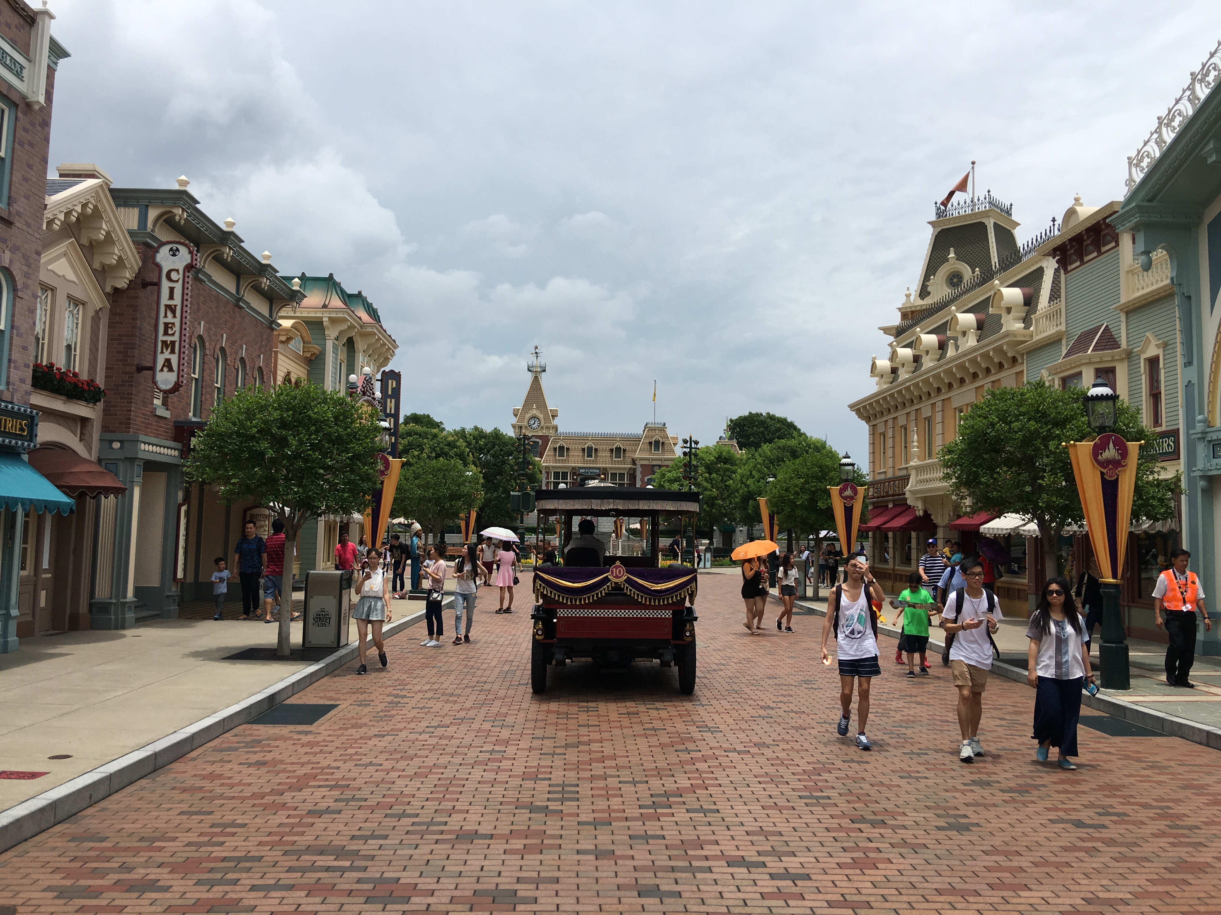 The Town Square to the Castle walk down Main Street U.S.A. in Hong Kong Disneyland is much safer than Disneyland Park due to the lack of Horse Drawn Street Cars. This also means there are no tracks and, instead, just a beautiful brick-paved street.