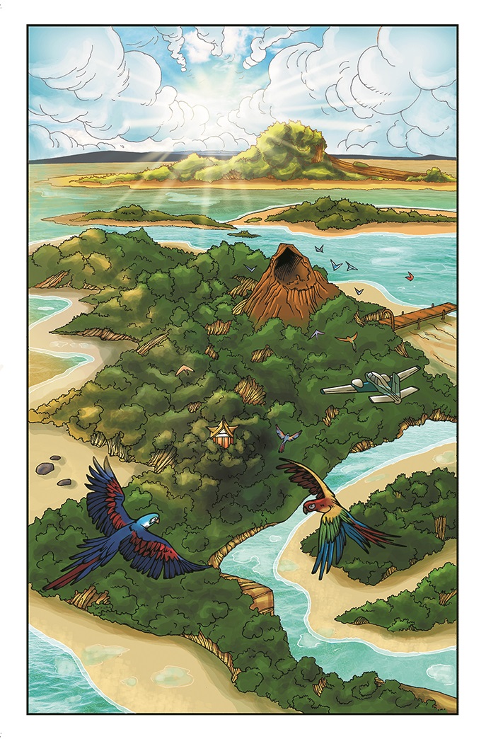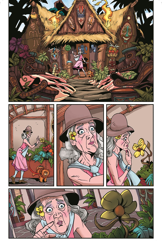 Writer Jon Adams, an Eisner and Harvey nominated illustrator and writer, has created a fun story to add depth to the time-honored attraction. It must be difficult to part of the Disney Kingdom and ascribe to it a back story, but the humorous undertones in Adams’ writing remind the reader not to take the outing too seriously. Pay close attention to the writing —Adams’ wicked sense of humor leaks into the narration on almost every page. The art work by Horacio Domingues delivers the kind of whimsy and color one would expect from a mystical, tropical paradise. The panels are playful and, like Adams’ prose, they offer their own surprises and fun gags.