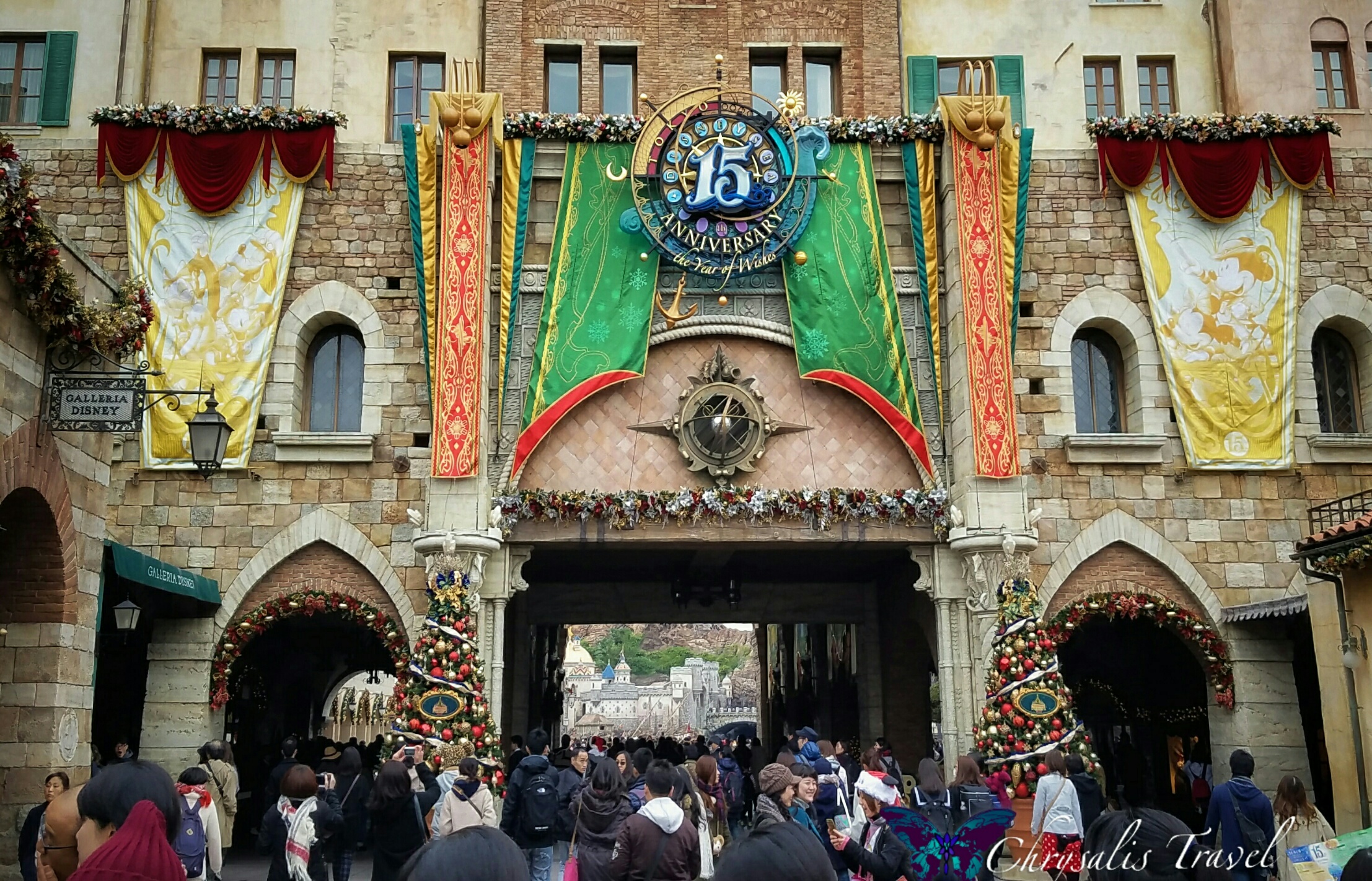 Tokyo DisneySea’s entry is draped in red and green banners, with evergreen garlands and two twinkling trees. The 15th Anniversary “Year of Wishes” crest glows brightly overhead.
