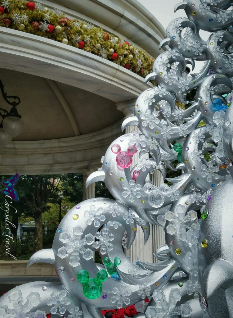 Each monorail station has unique seasonal decorations. Tokyo DisneySea’s station has a blue theme on this tree. Tucked underneath is a large crystal (part of the crystal Wishes theme), and a Mickey and Minnie ‘SnoSnow’ with their own personal monorail.