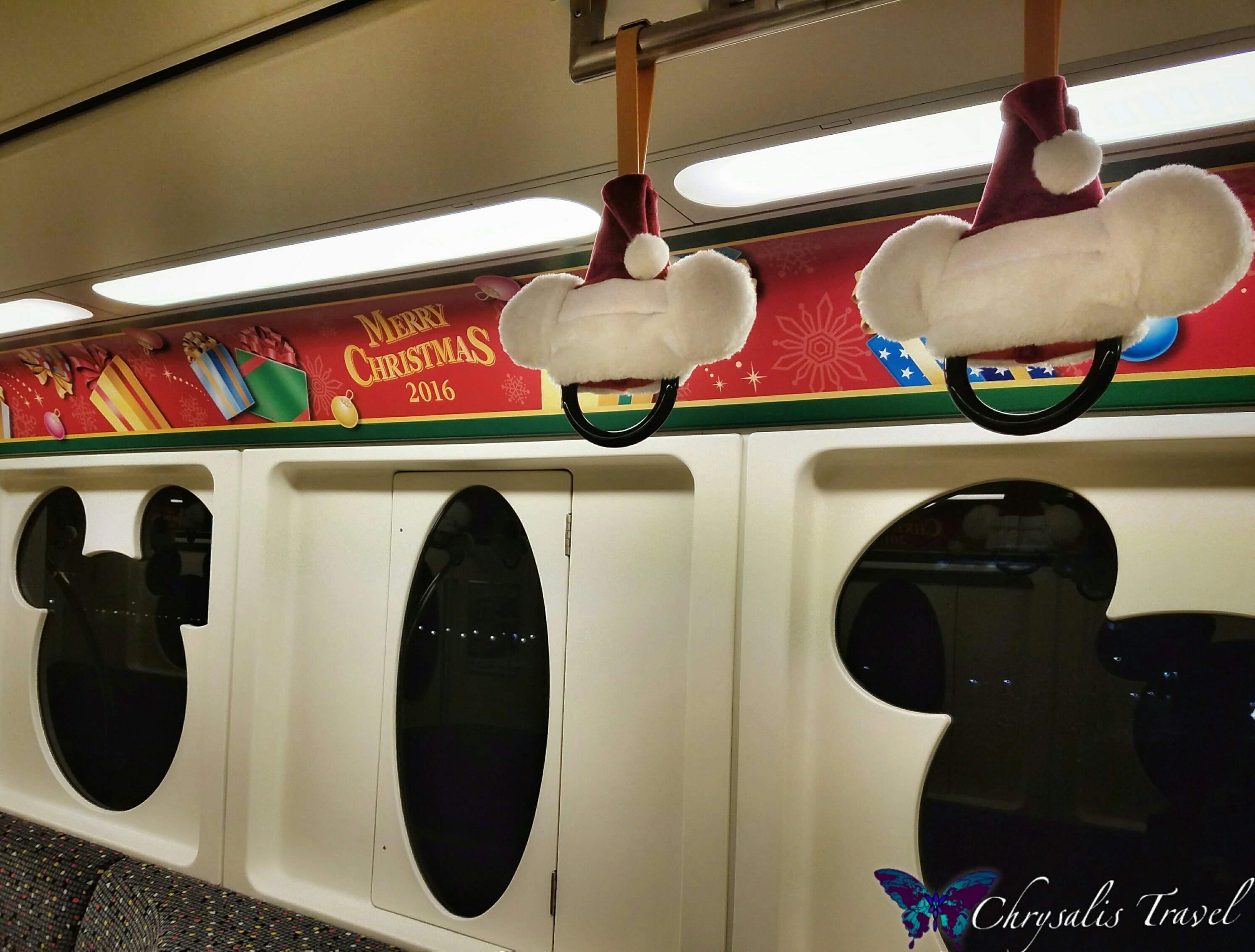 The Disney magic starts as soon as you board the monorail. Mickey Santa hats decorate each hand grip and add a whimsical touch. Banners on the monorail read “Merry Christmas 2016.”