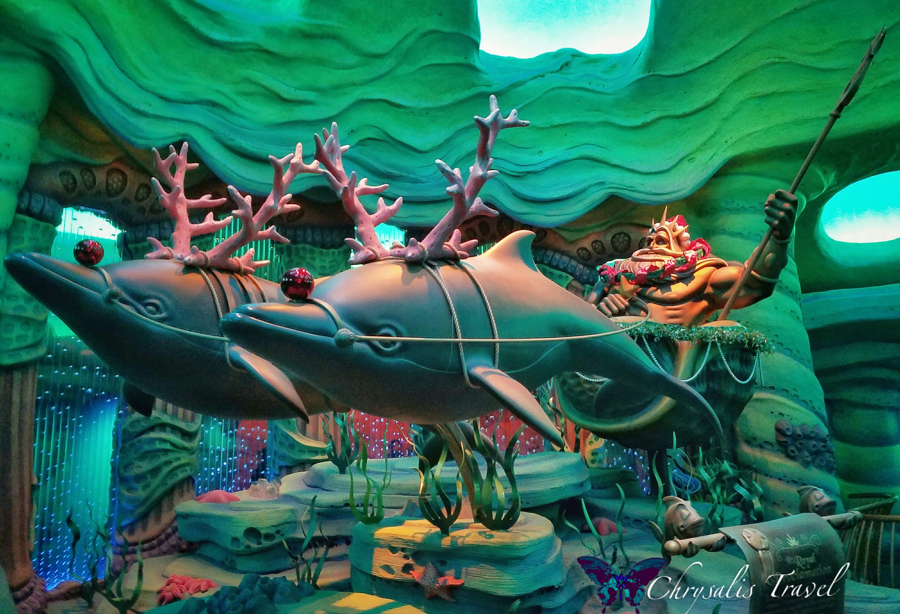 King Triton’s dolphins don reindeer antlers for the holiday season in Mermaid Lagoon.