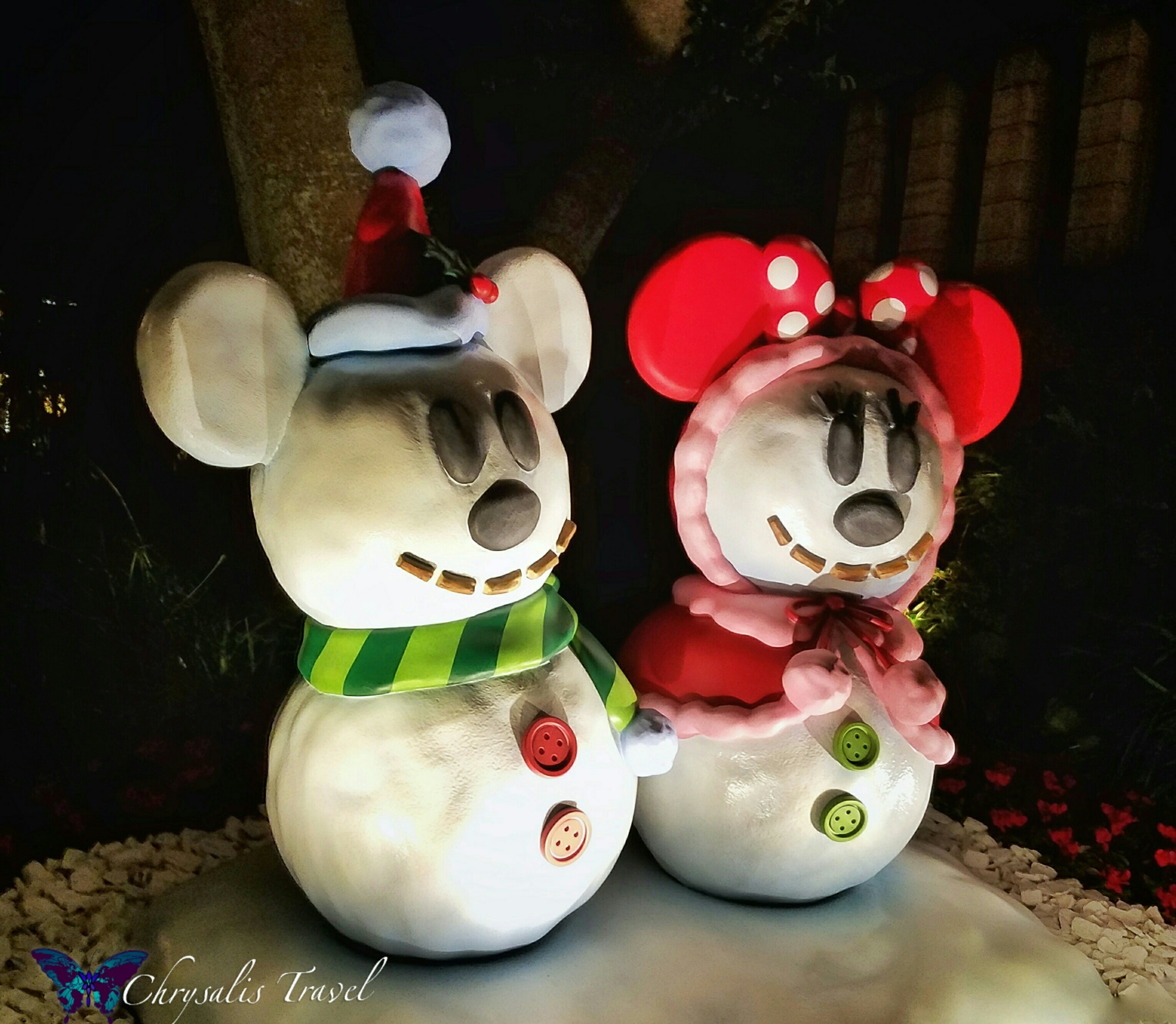 Mickey and Minnie ‘SnoSnow’ sculptures stand on a patch of snow near the American Waterfront.