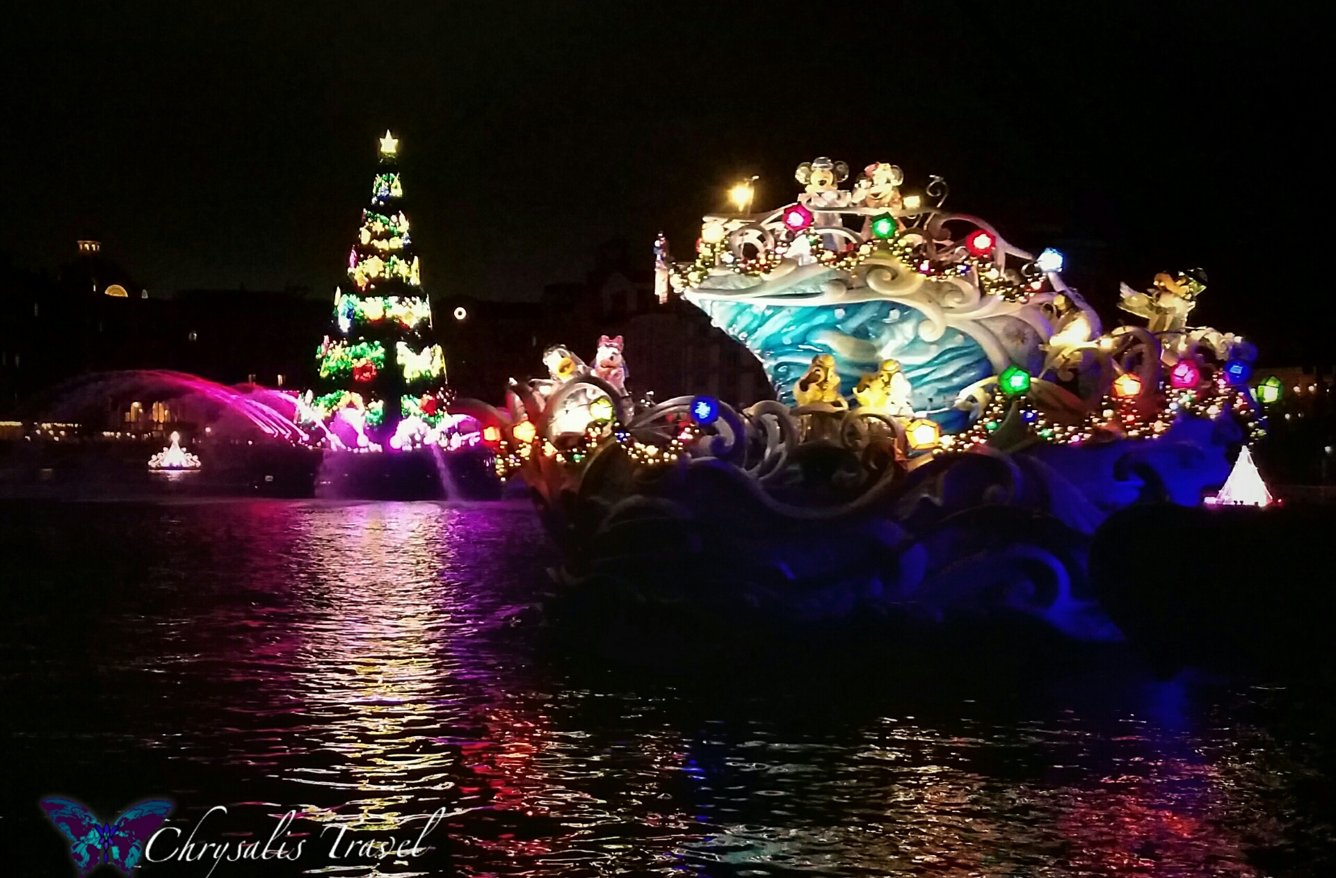 The Fantasmic Sorcerer’s hat is transformed into a 15-meter tall lighted Christmas Tree for this 15-minute show. Mickey, Minnie, and friends are dressed in the colors of their Wishes Crystals. They sail around the harbor on main Christmas ship.