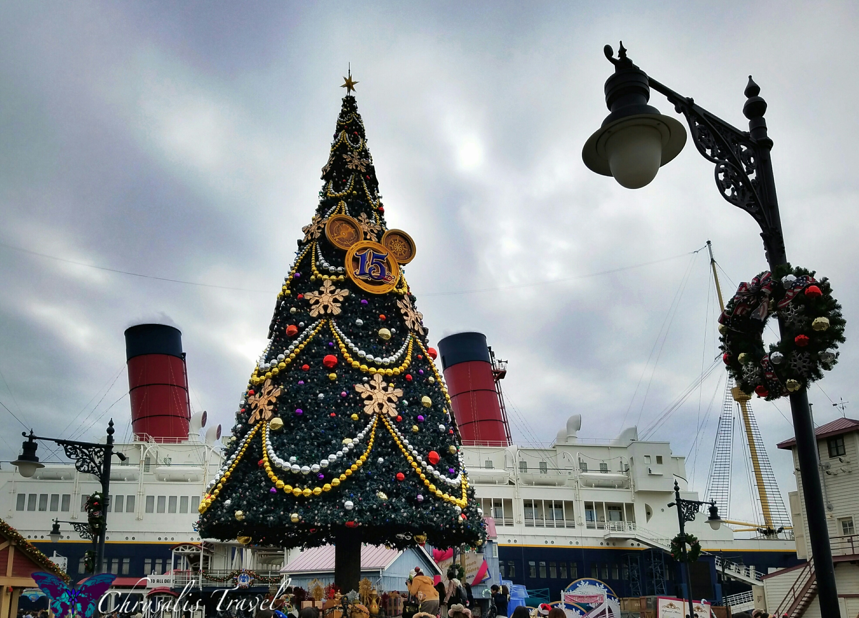 As you step through the entry arch, “Buon Natale” banners celebrate Christmas in the Mediterranean Harbor Italian theme. Mickey, Minnie, and friends herald the holiday season as you continue in through the park.