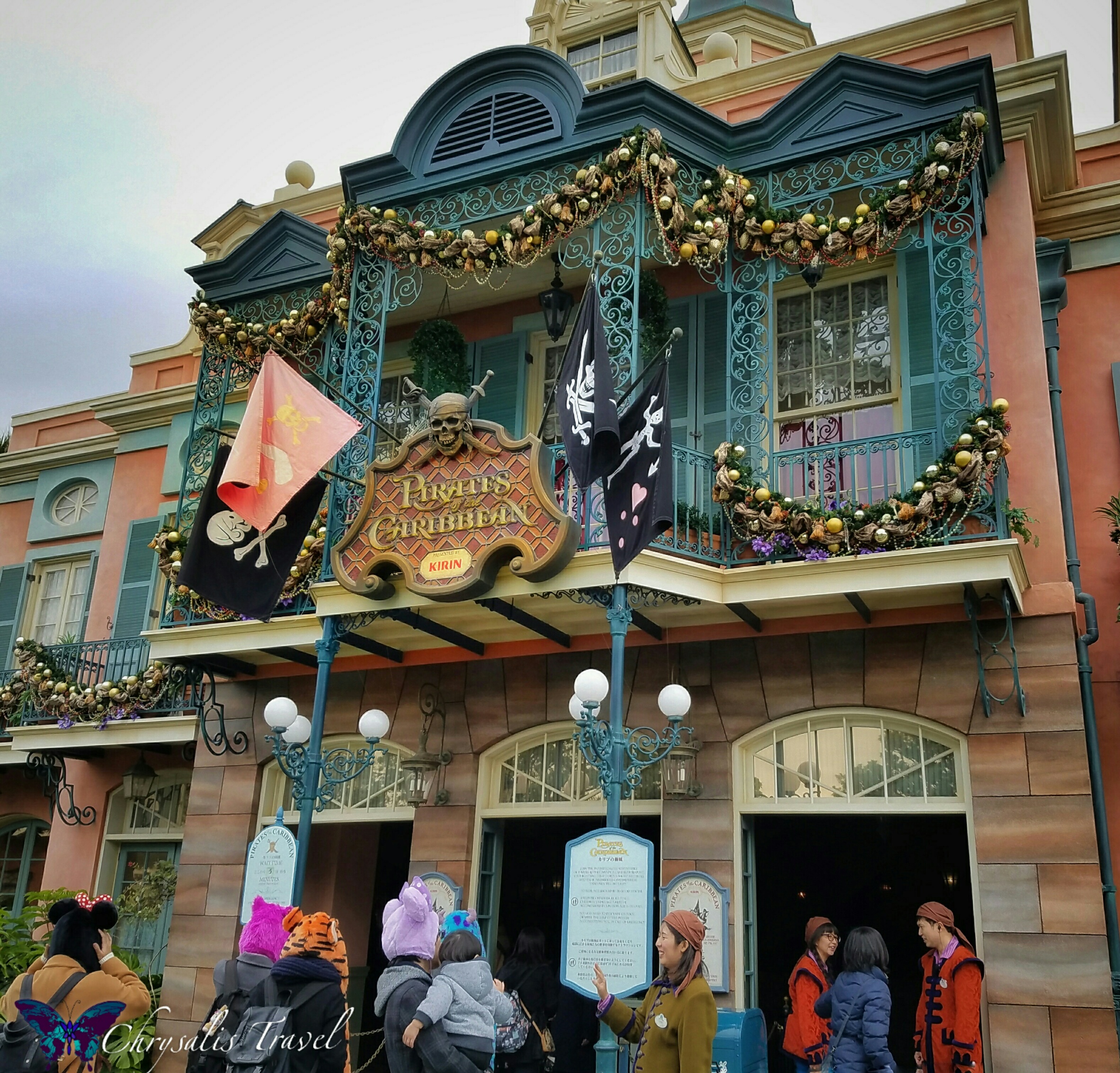 Festive garlands drape across the Pirates of the Caribbean balcony. It gets cold in Tokyo, so Disney conveniently sells warm character hats for guests’ convenience.