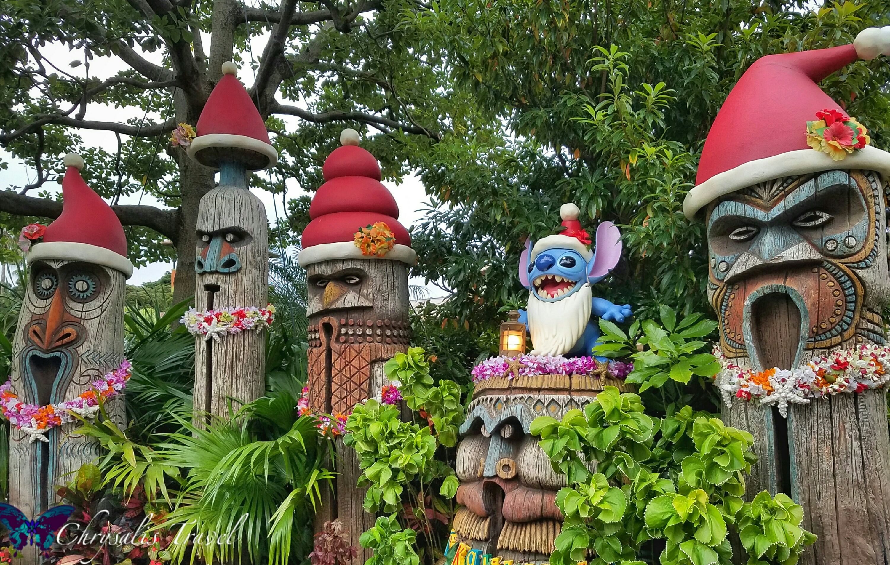 Lilo, Stitch, and Hawaiiana are very popular in Japanese culture. Stitch, who has taken over the Tiki Room at Tokyo Disneyland, poses with Santa-hat tikis in Adventureland.