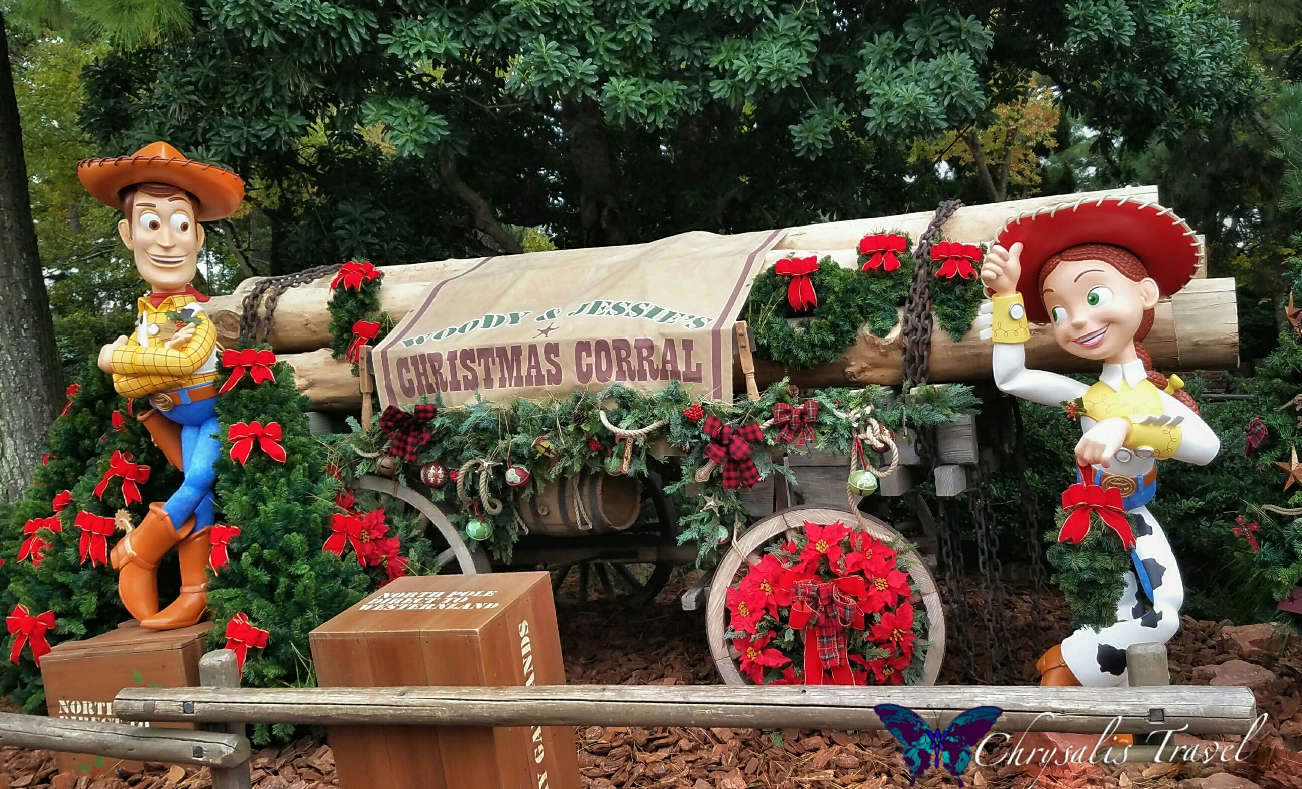 Woody and Jesse are ready for a roundup at their Christmas Corral in Westernland. Big Thunder Railroad is just to the left of this picture.