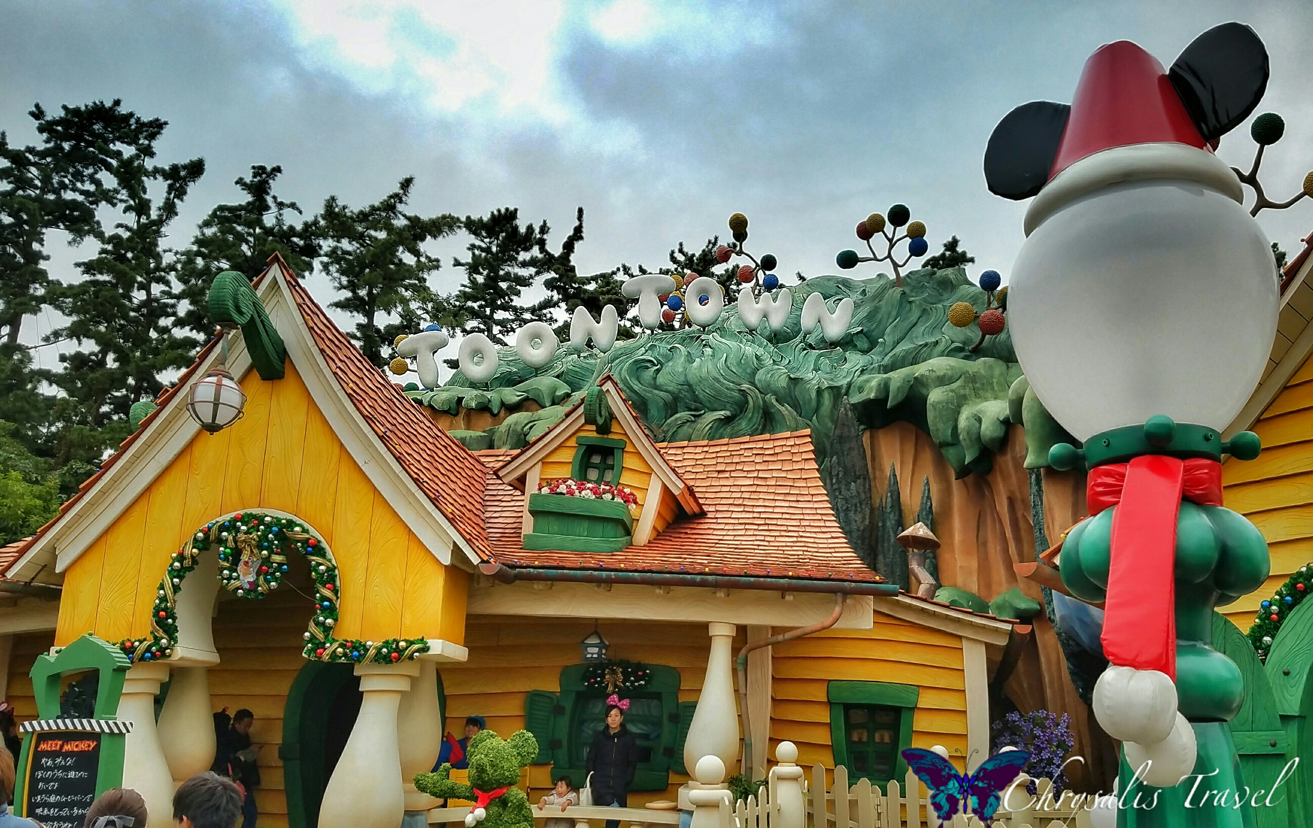 Even Toontown is decorated for the holidays. Mickey-eared Santa hats top the Toontown lamps, and garland trims Mickey’s house.