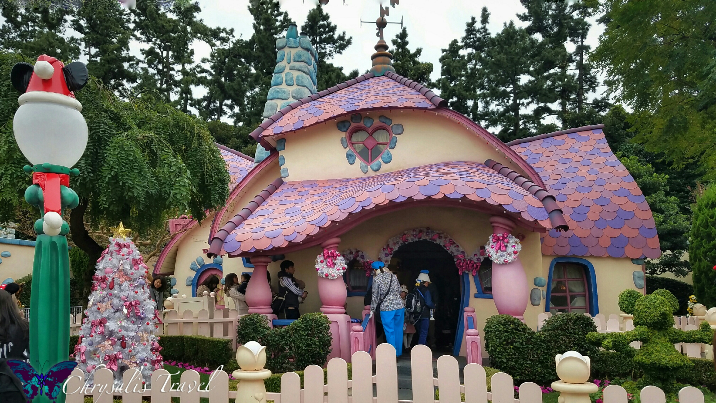 Minnie’s house is decorated with a pink and white tree, and wreaths. The line for Minnie’s house is much shorter than Mickey’s… apparently, there is no meet-and-greet with Minnie inside her house.
