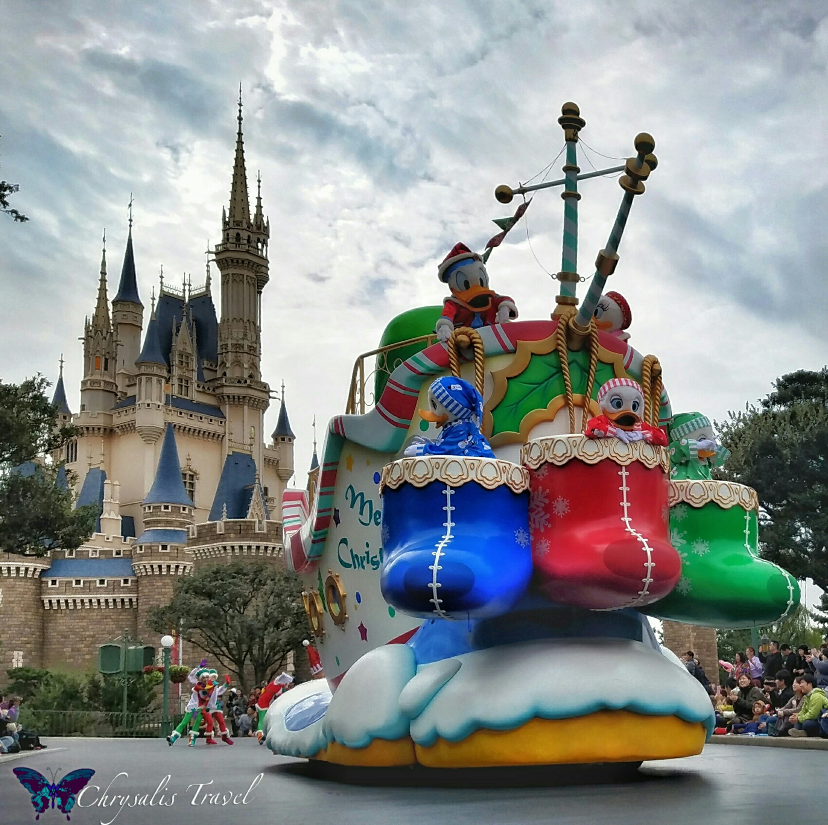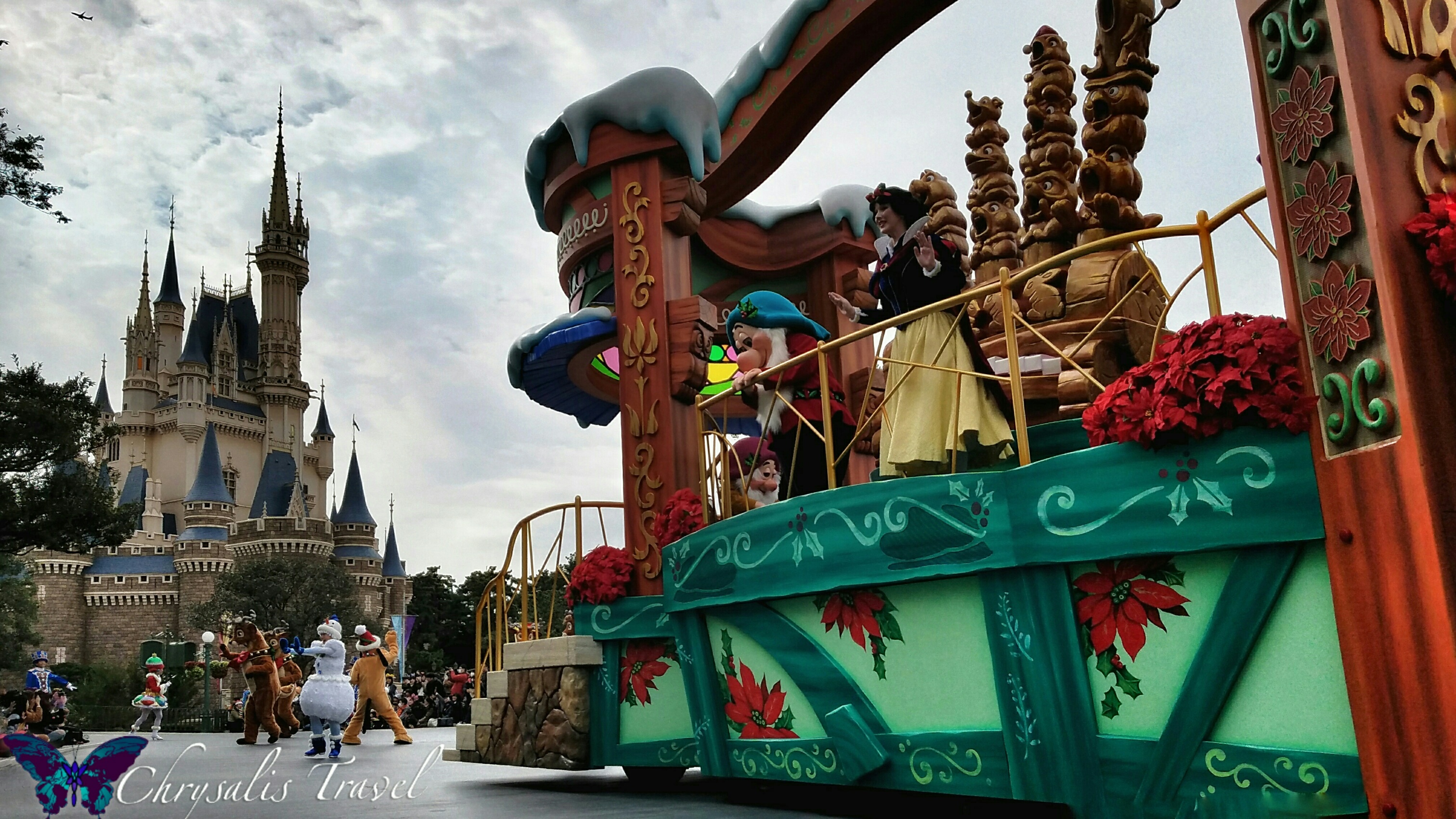 I love the snowmen and snowwomen in Disneyland Anaheim’s Christmas parade – Tokyo Disneyland has different snowmen, as well as snow-people dancers. Elves (seen under the main Christmas tree, and with Goofy and Donald in the hub) also dance in the parade.