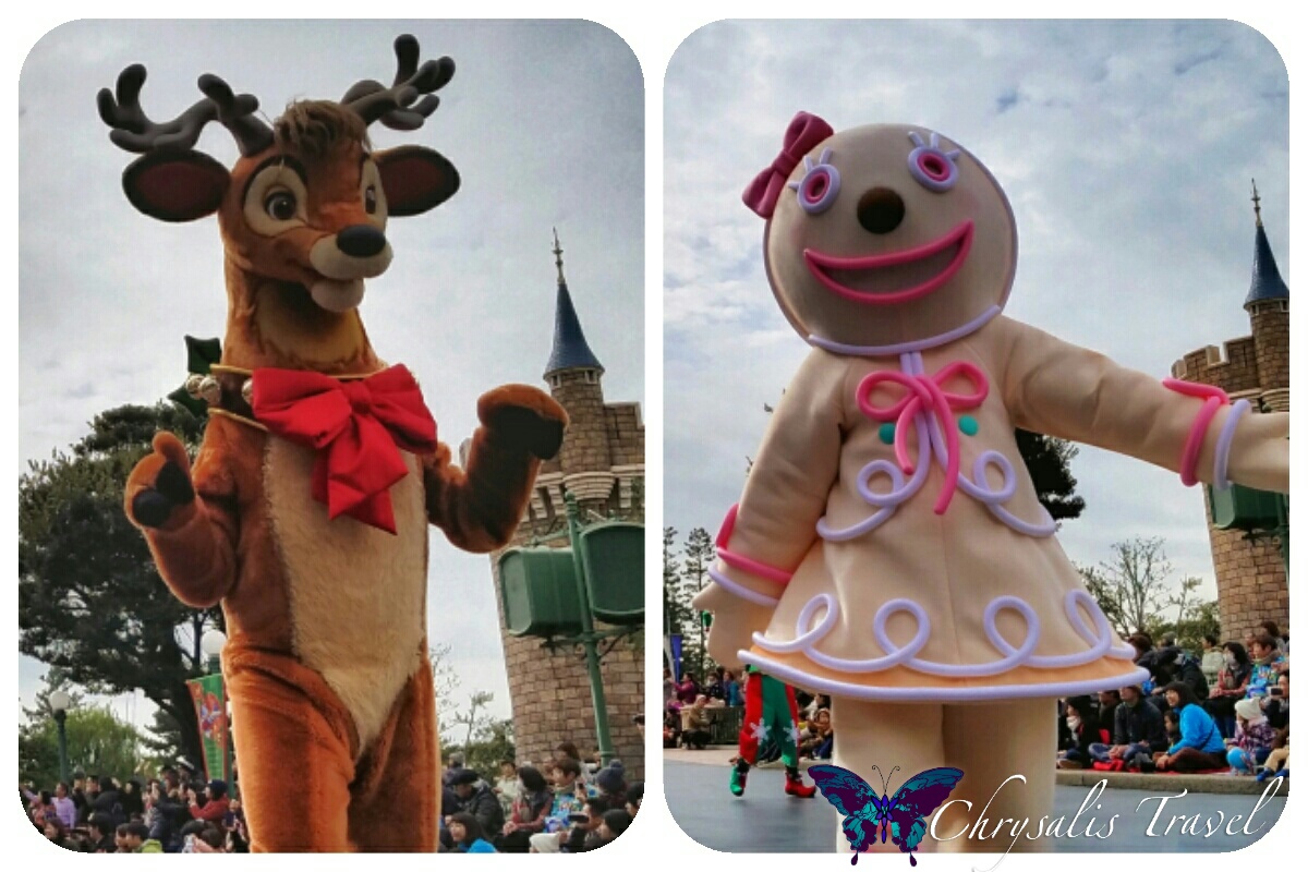 Many characters were familiar, but there are some unique characters in Tokyo. Pluto prances with familiar-looking reindeer. There are only two gingerbread people (one of my favorites) in the parade – and one is female! Of course, there is also a Frozen float with Anna and Elsa.