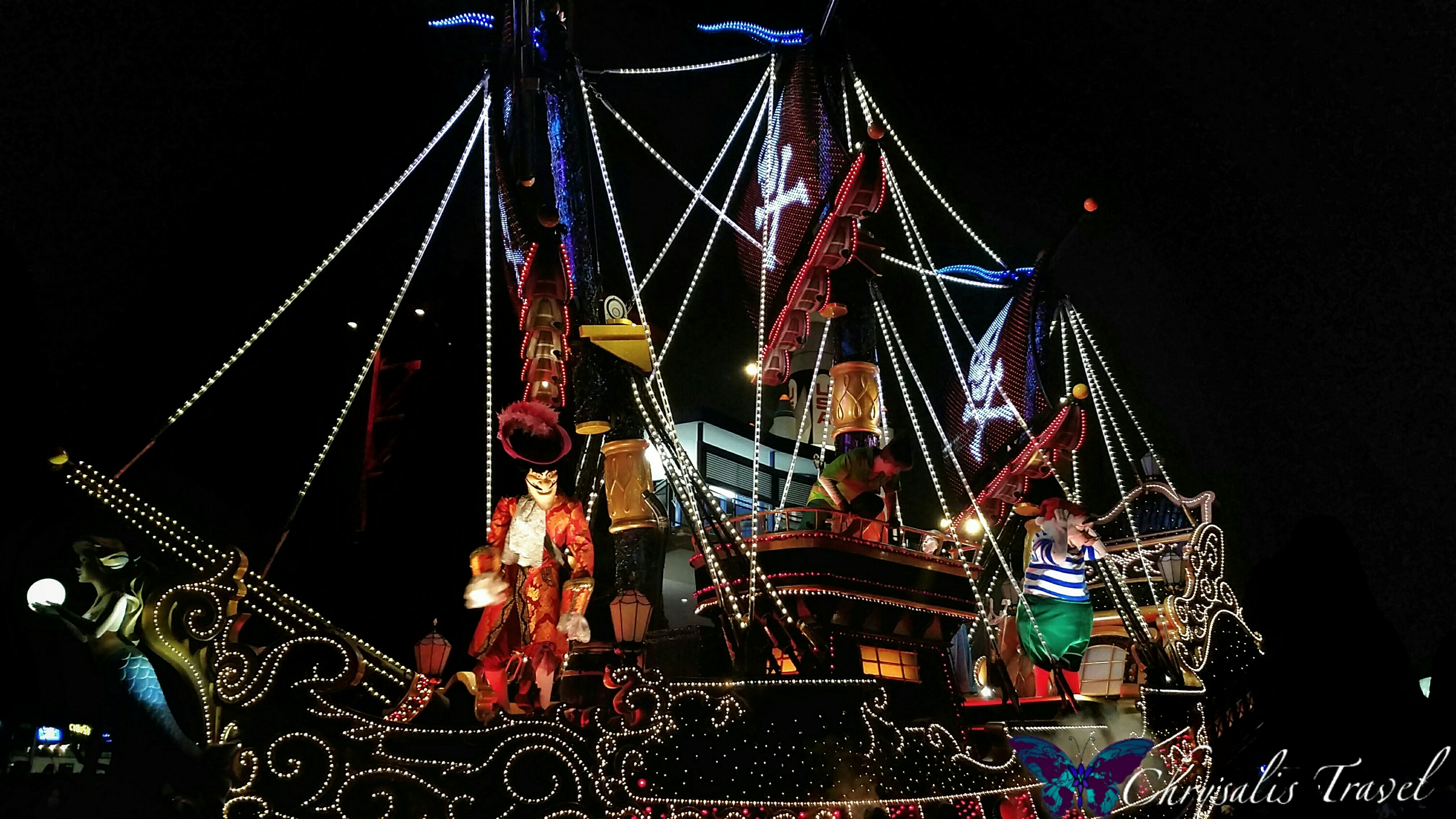 “Dreamlights” presents a highly-advanced, elegantly-animated light show. Some of the most impressive animations were on Captain Hook’s ship. The sails would change between ‘clear’ – to the Jolly Roger (pictured) – to red and white stripes – and starry sky.