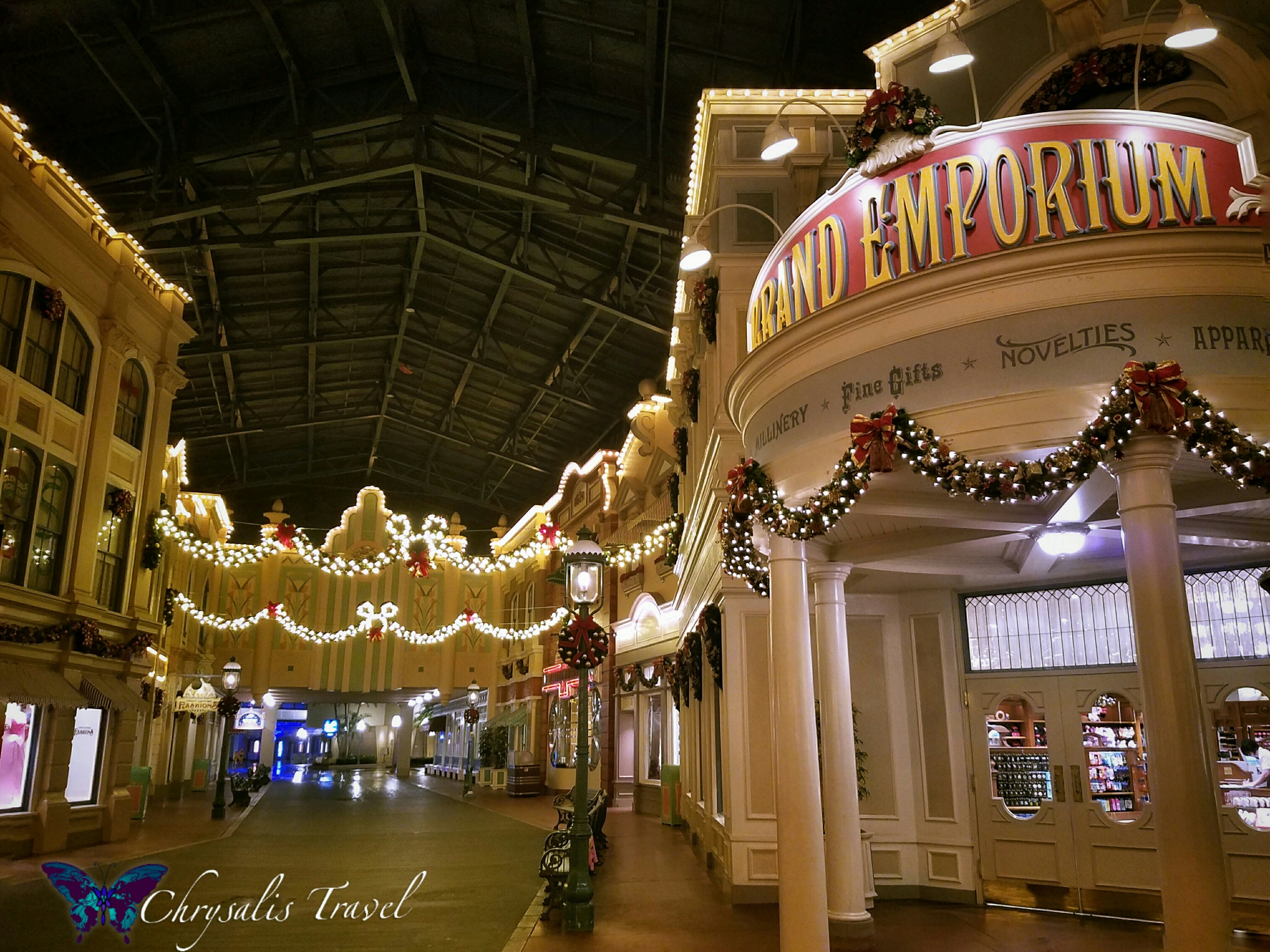 Garlands and trees decorate the entry arch to the World Bazaar (their covered ‘Main Street’). The sign above reads “Christmas Fantasy 2016.” As you cross under the arch, you meet guests taking pictures of immaculate shop windows showcasing favorite Disney characters.