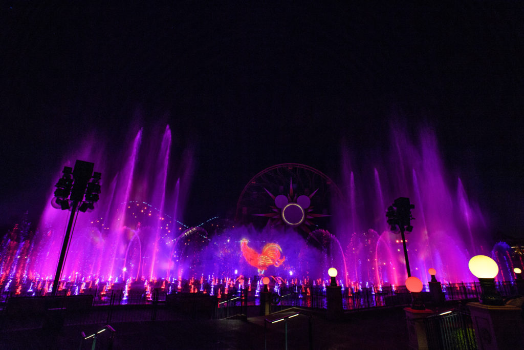 But of course, the highlight of the celebration is the World of Color pre-show, “Hurry Home – Lunar New Year Celebration.” This new offering tells the tale of a journey home for Lunar New Year. The six-minute feature is presented in sequences, utilizing projected animation along with the lighting, special effects and the powerful fountains of “World of Color.”