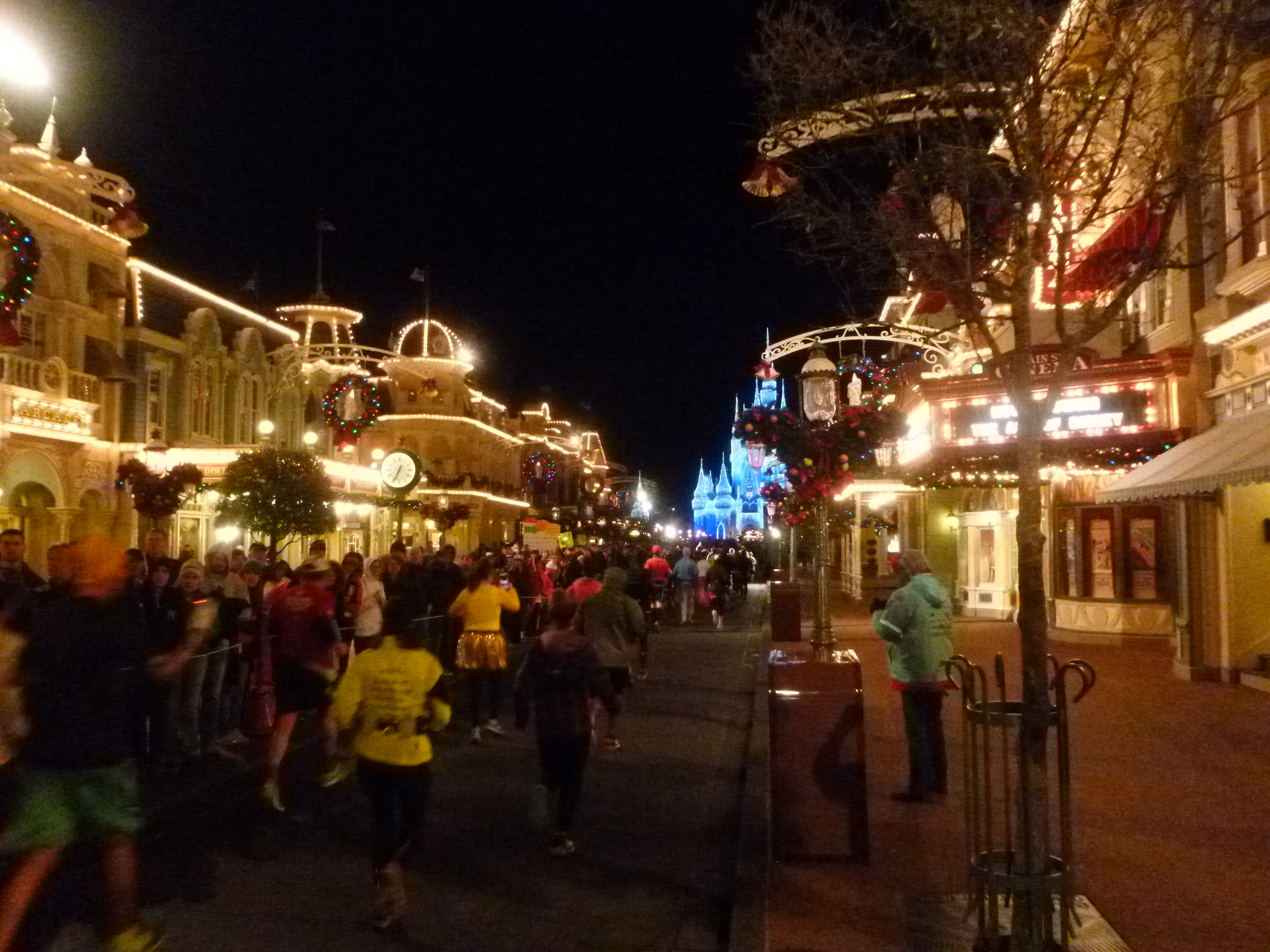 Marathon morning started out cold, with pre-dawn temperatures in the mid-30’s and frequent gusts of wind. When packing for the trip more than a week earlier, I knew cold temperatures were possible (ghost stories of the snow during Marathon Weekend 2010 are still told among runners), but I didn’t actually expect anything like this. Luckily, I had some extra space in my suitcase so I came prepared and was able to cobble together a suitably warm outfit with running tights, shorts, a t-shirt, sweatshirt, gloves, headband, and an old foil blanket that got discarded just before the start line to not interfere with the electronic timing system. Although I was planning to ditch it as soon as I warmed up, I ended up wearing my sweatshirt until after the Magic Kingdom, around mile 7. I kept the gloves on until I entered the Studios at mile 23, and never got quite warm enough to remove my headband. Once the sun came up, the temperatures were surprisingly comfortable for running, though it was still quite cold after crossing the finish line and standing still for a few minutes.