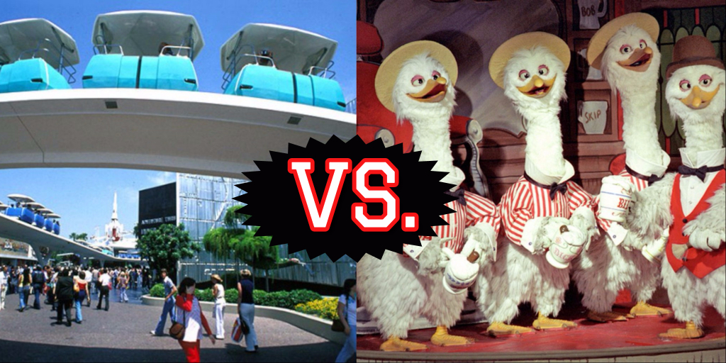 Our first match-up of round one finds two Disneyland Tomorrowland classics going head to head: the PeopleMover and America Sings. Incidentally, both still have some representation in the park as the PeopleMover tracks are still intact and the America Sings cast can be found from Star Tours to Splash Mountain. And of course there is still a version of the PeopleMover alive on the East Coast