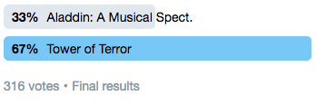 Last Friday two favorites from Disney California Adventure hit the court to see who would advance to Round Two. Although Aladdin: A Musical Spectacular tried its best to keep one step ahead, the Twilight Zone Tower of Terror's departure was just too fresh a wound for fans to ignore.