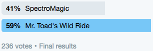 Yesterday Magic Kingdom's long-running nighttime parade SpectroMagic took on Mr. Toad's Wild Ride to determine who would represent Magic Kingdom in the Fantasmic Four. In the end, Mr. Toad's fanbase proved too strong for Spectro to overcome: