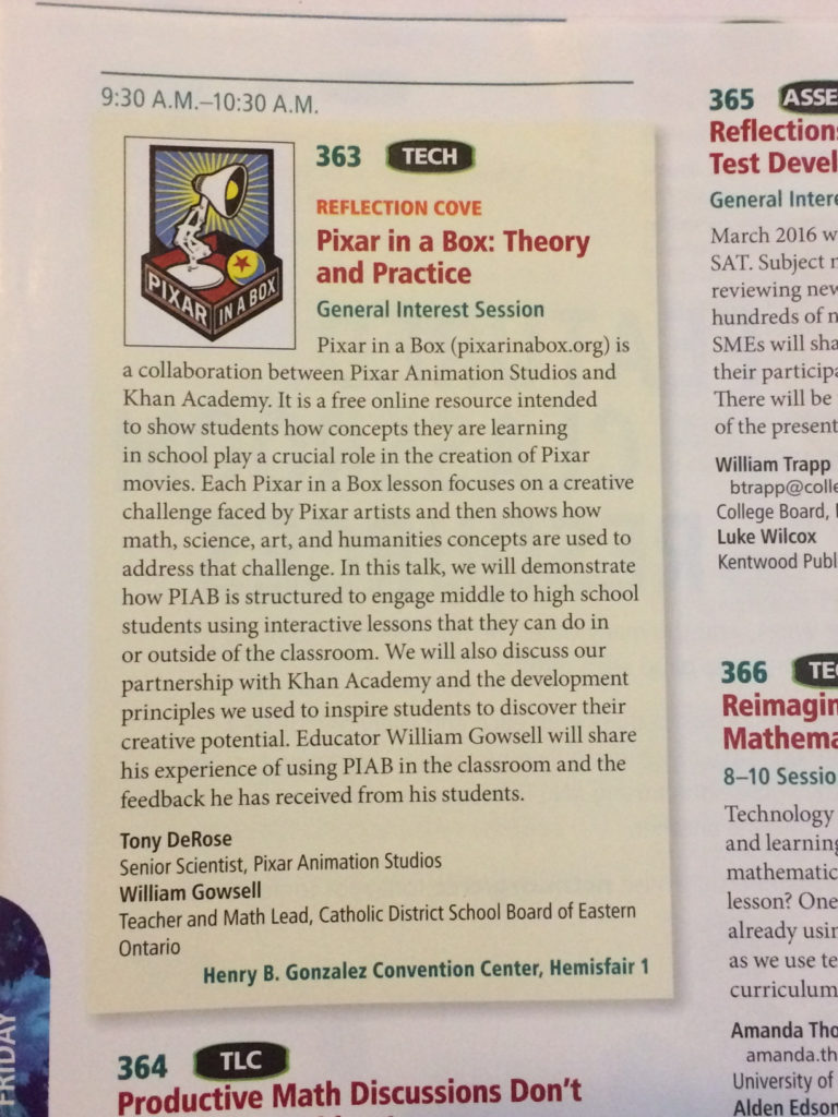 After writing about Pixar’s new education initiative with Khan Academy, Pixar in a Box, and sharing my experiences about using Pixar in a Box in my classroom through social media, I was invited to present at the National Council of Teachers of Mathematics (NCTM) annual conference in San Antonio from April 5th through the 8th. I was the second part of the presentation talking about and showing how Pixar in a Box is used in my math classroom. Tony DeRose from Pixar, who heads Pixar in a Box, would start the hour-long session off.