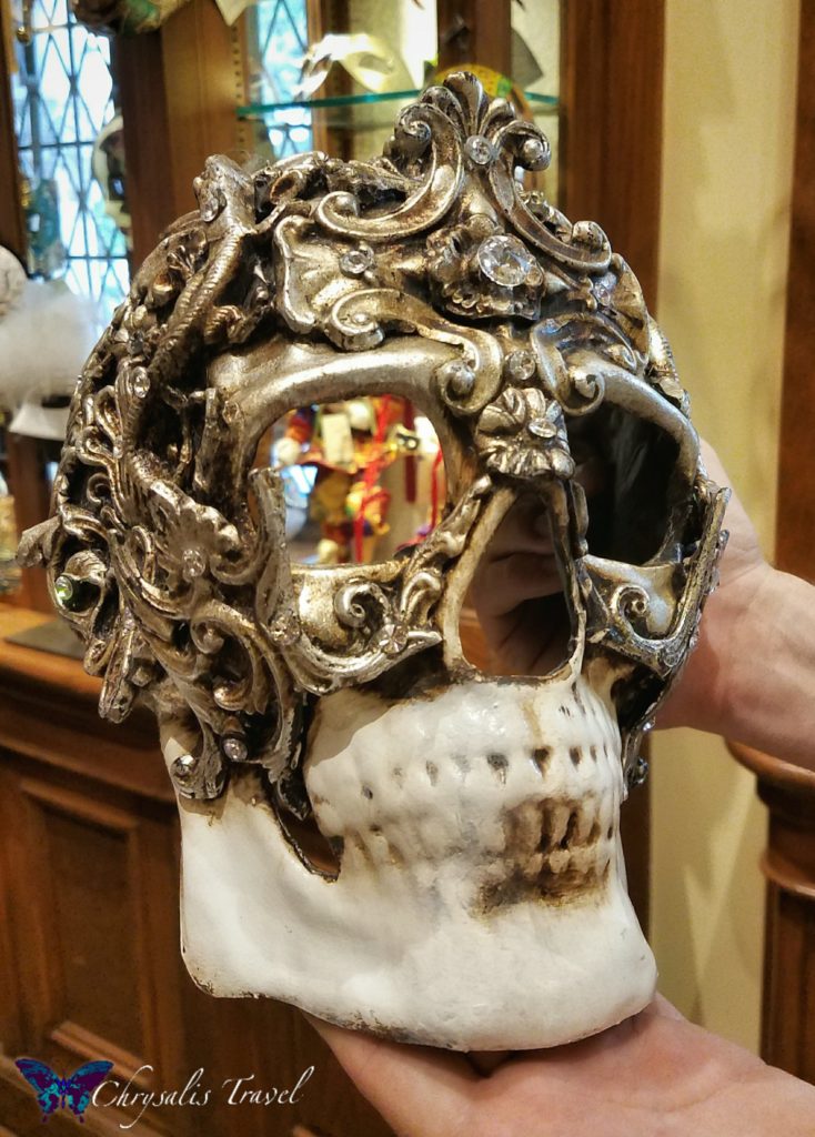 Each mask takes several hours – up to a week – to complete, as many layers are applied. Some masks have gold-leaf. Others have crystals and feathers. Each one is hand-crafted with amore. Papier-mâché masks are priced from $50.