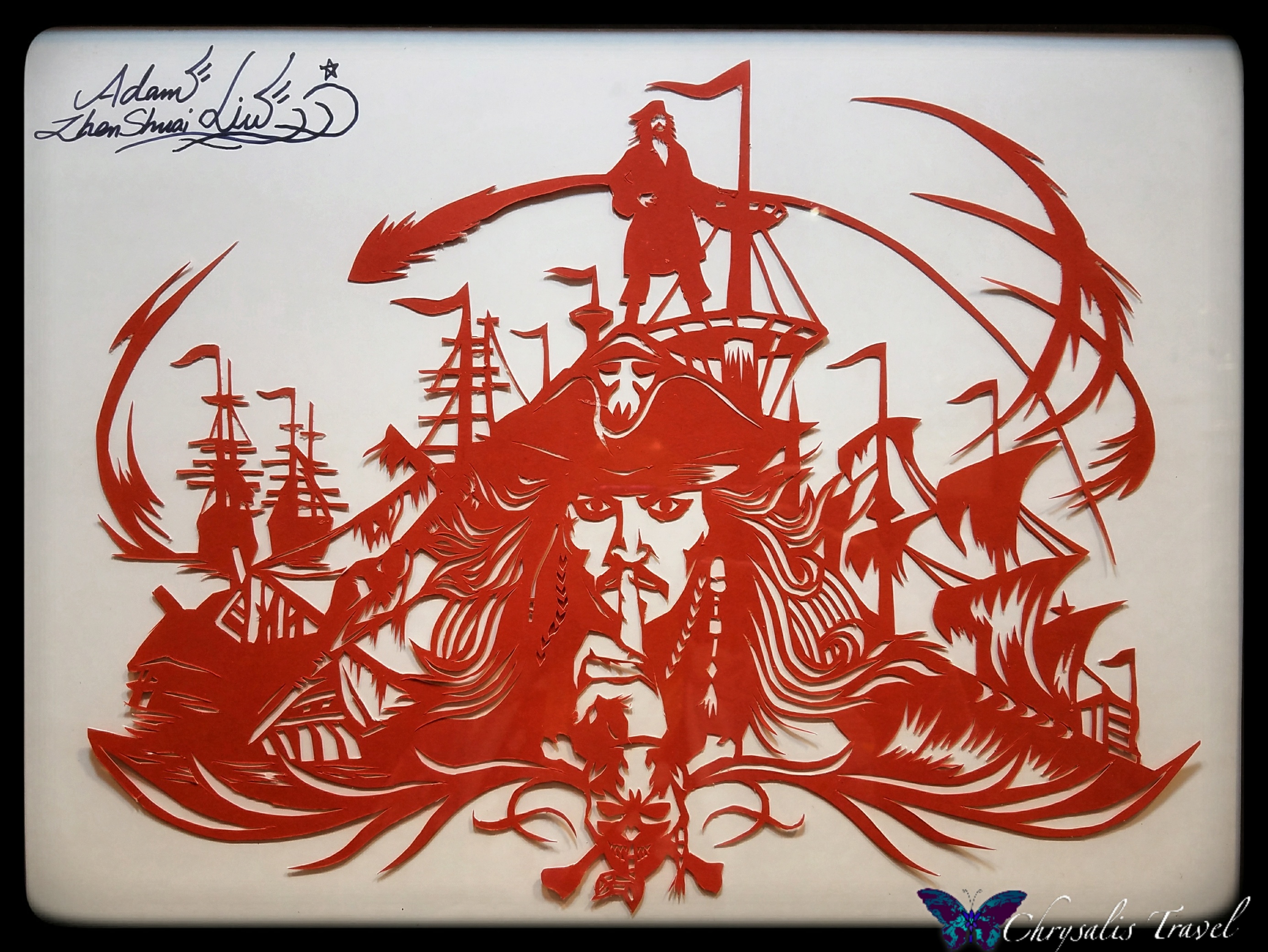 While waiting in the queue, guests could enjoy extraordinary entries from the Design Challenge. The theme honored 50 Years of the Pirates of the Caribbean at Disneyland. There were so many remarkable pieces of fan art. These were some of my favorites.The artist cut this image from one piece of paper. It is a striking likeness of Jack Sparrow with many pirate ships. Look closely. The overall silhouette created by the pirate ships outlines a Disney castle.