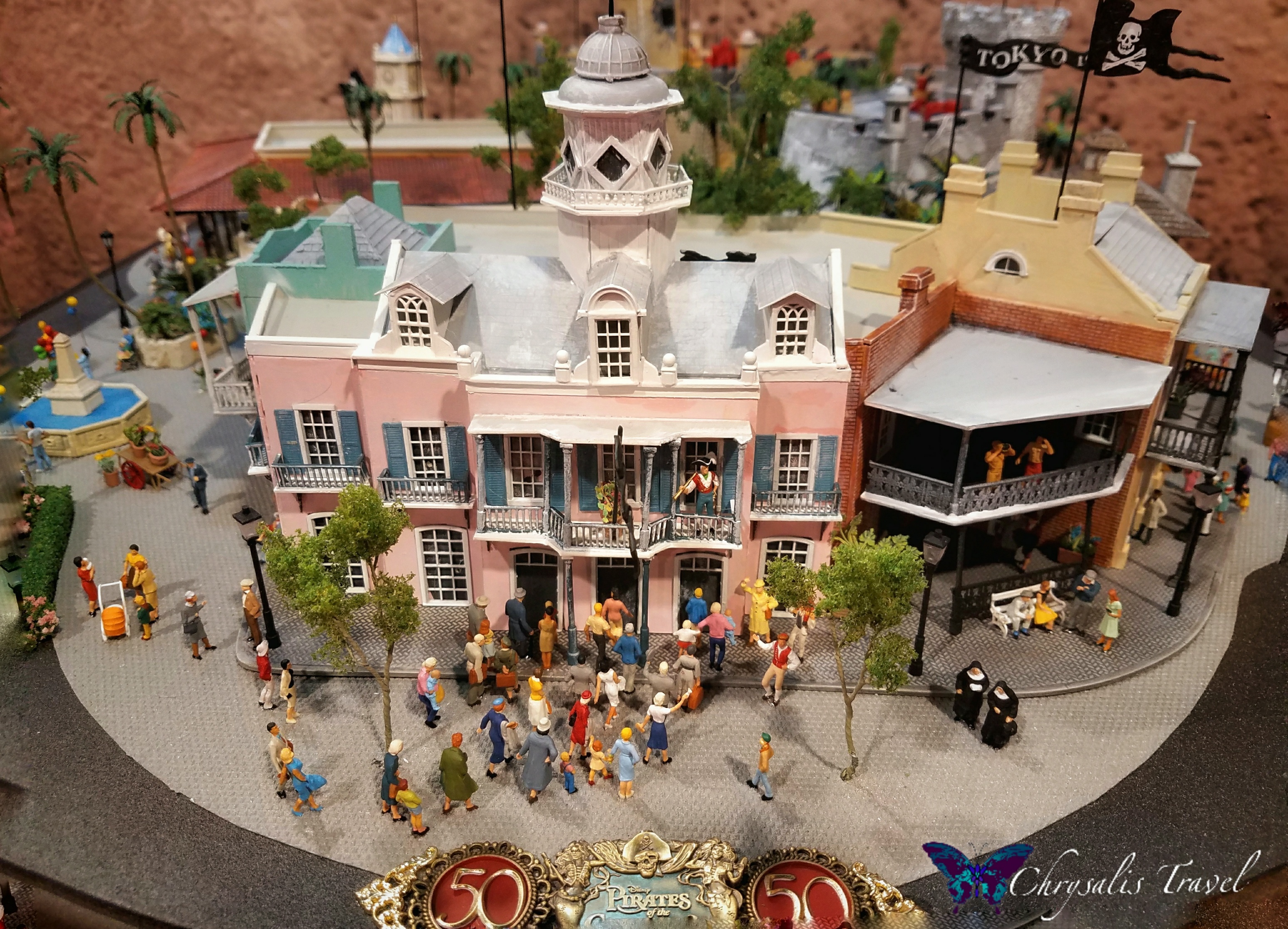 Having been to all six Disney castles, I particularly adore this piece. This model features façades of all the Pirates rides in Disney Parks around the world. Front and center is the original Pirates in New Orleans Square. To the right: French-inspired entry in Tokyo Disneyland. To the left: Spanish fort from WDW’s Magic Kingdom.