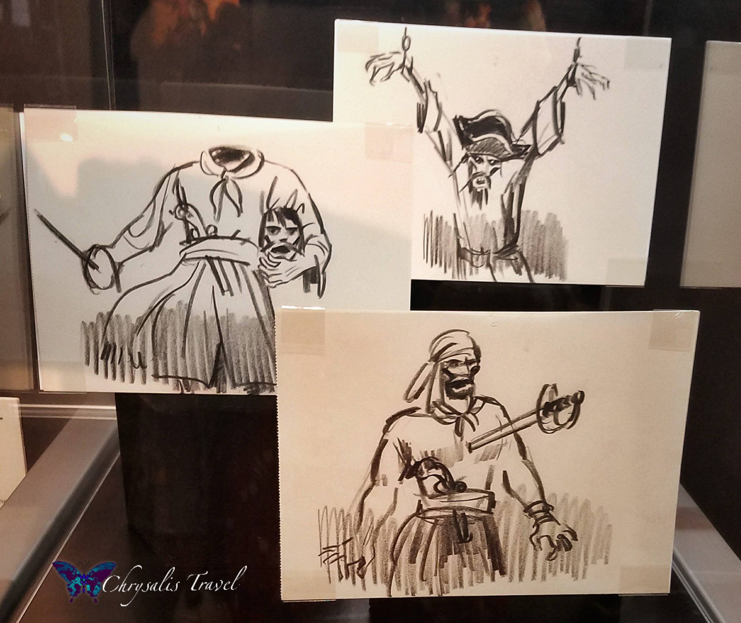 Paying homage to Captain Hook, the Archives presented a Peter Pan ride vehicle. They showcased animation cells from Peter Pan, as well as concept sketches for Hook’s costume in Fantasmic.
