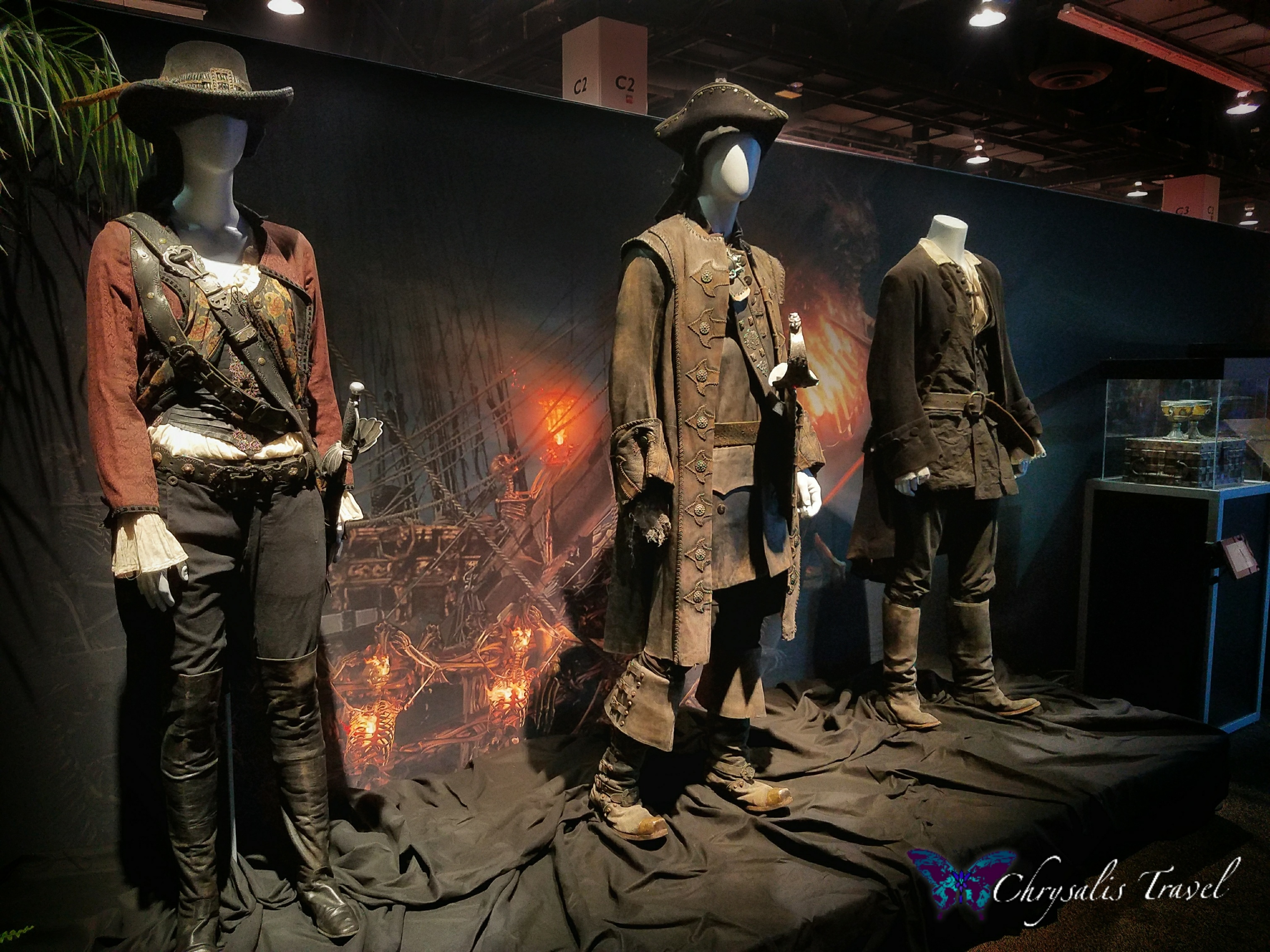 Costumes from On Stranger Tides, including Angelica’s (Penelope Cruz’s) complete outfit. Also on display: international Brethren Court pirates’ costumes from At World’s End, and British costumes (including Governor Swann’s) from the original Curse of the Black Pearl.