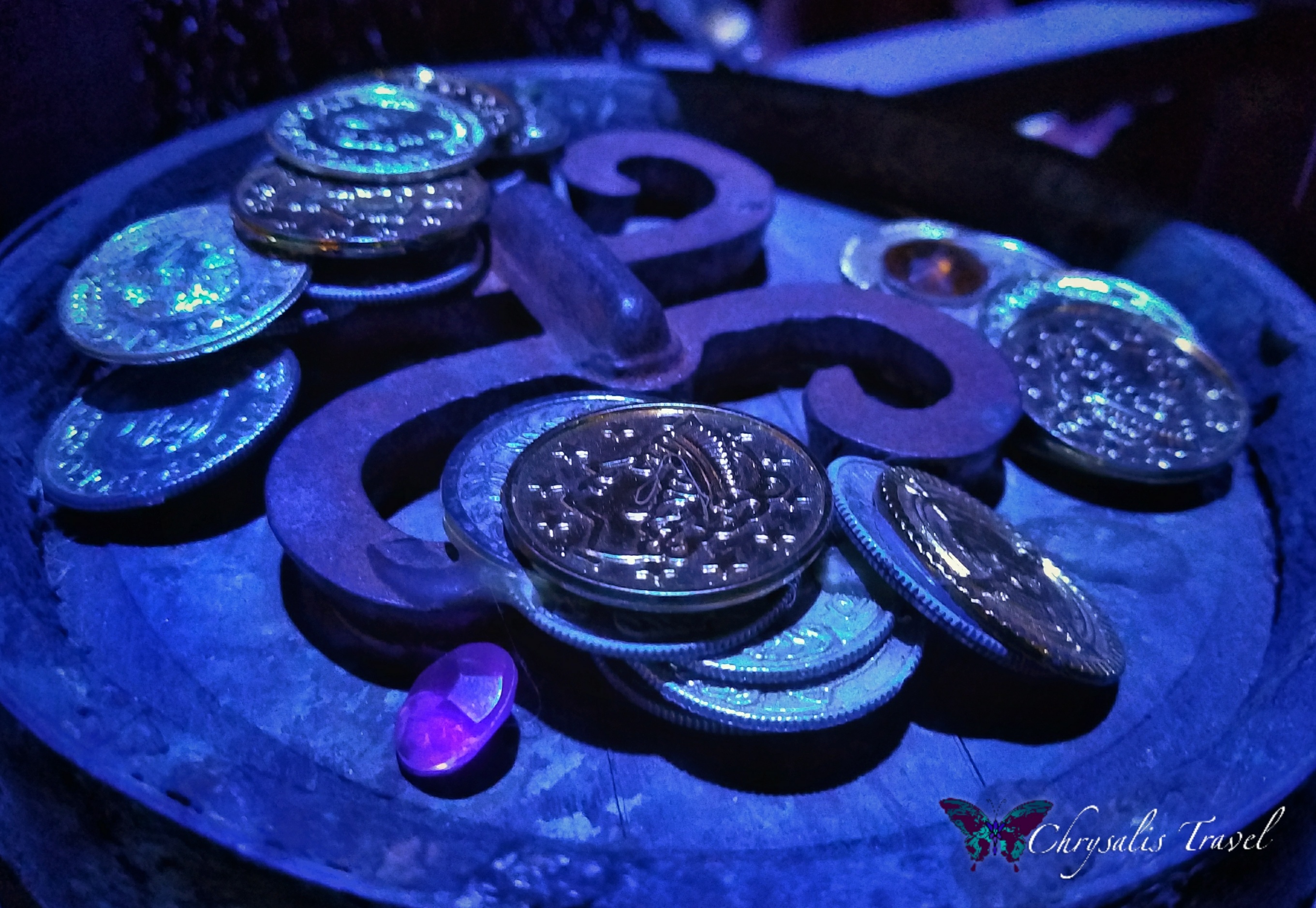 Who can forget the beating heart in Dead Man’s Chest? Here is the chest, Davy Jones’ keys, and the jar of sand in which Captain Jack carried ‘thump thump.’ Also on display in a case: a plate with a single peanut, reportedly used by Johnny Depp.
