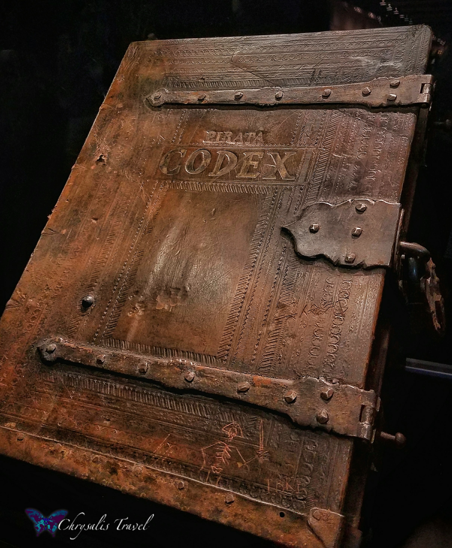 Who can forget the beating heart in Dead Man’s Chest? Here is the chest, Davy Jones’ keys, and the jar of sand in which Captain Jack carried ‘thump thump.’ Also on display in a case: a plate with a single peanut, reportedly used by Johnny Depp.