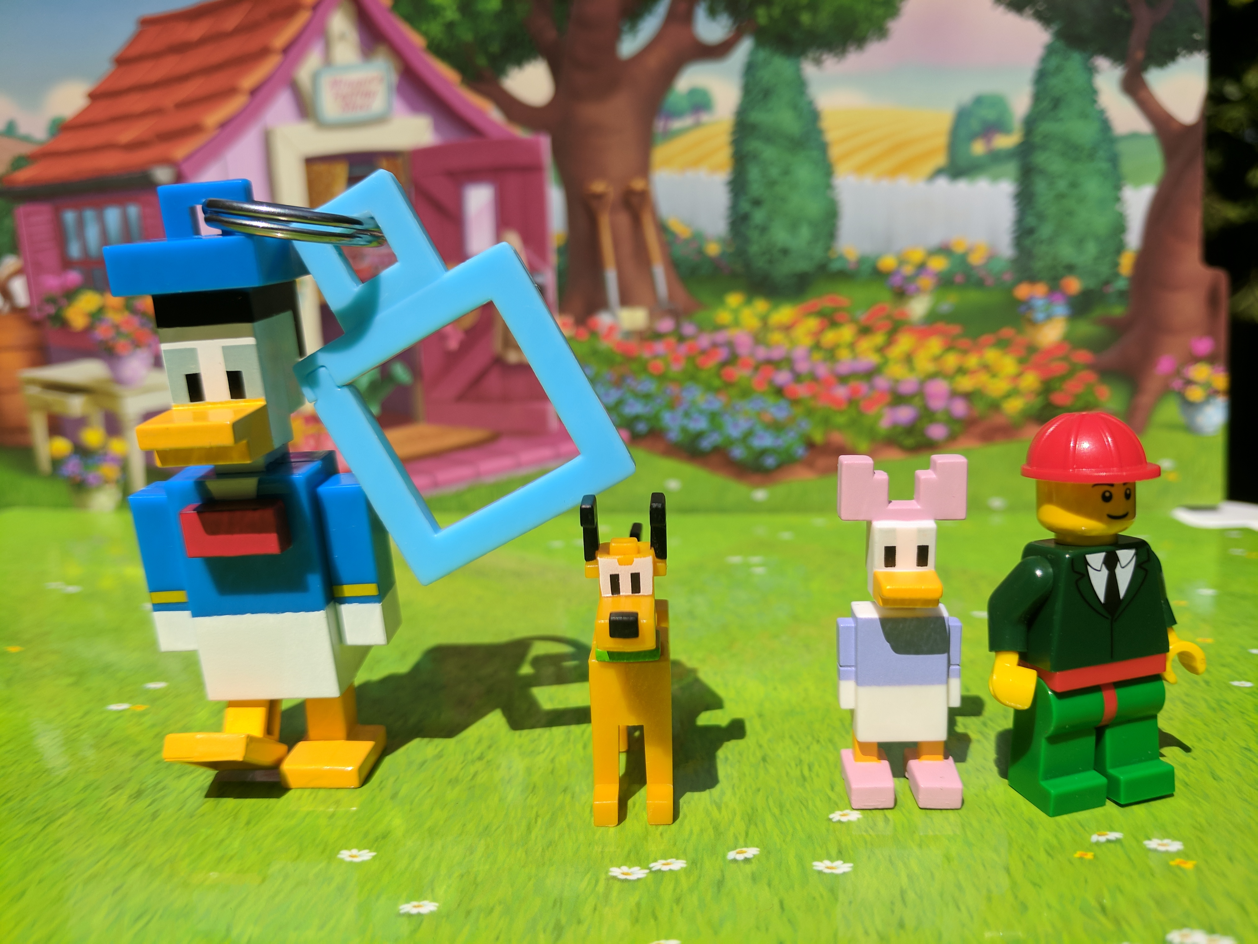Twelve characters, including Mickey, Minnie, and have been released in the Series 1 Disney Crossy Road Hanger (A.K.A. keychains). These figures are taller than the minifigs and our Donald’s legs moved back and forth so that he could be positioned as if walking across the table. They are sold individually in blind pack bags for $4.99 and feature a square hoop for hanging off a backpack or keychain.