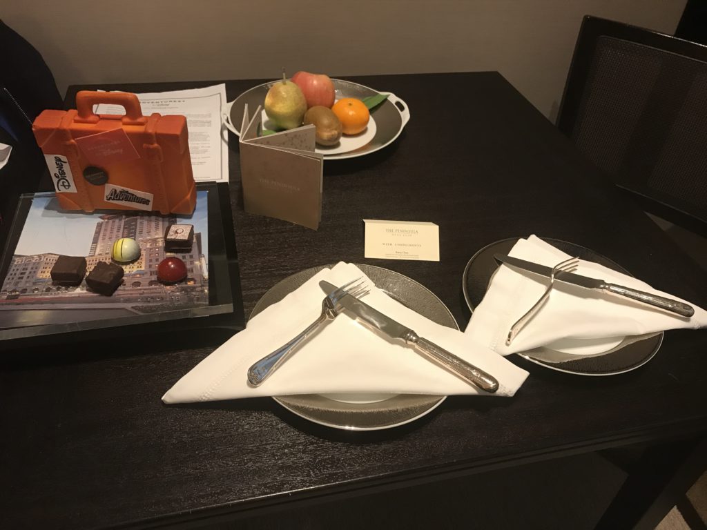 We then took the return cable car trip and picked up another taxi to return to our hotel. As I had become enamored with our accommodations, I wanted a souvenir. I went to the Peninsula Boutique at the hotel and picked up a teddy bear that wears one of the uniforms of the hotel. We then went back to our rooms to rest and prepare for dinner. Upon arrival to the room, I first noticed that they replaced the fruit plate. I then noticed this chocolate Adventure by Disney suitcase accompanied by assorted treats. What a way to spoil my dinner. As some of our fellow Adventurers sold my mother on the South Africa trip, I started researching that itinerary for her. I then freshened up and went downstairs for dinner.