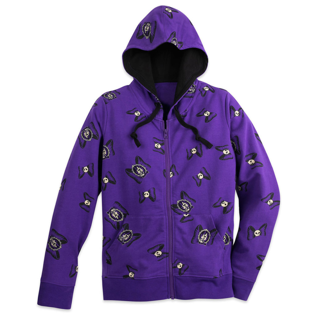You'll join the ''Skull & Bows'' society while visiting favorite haunts in this Halloween hoodie glittering with a ghoulish Minnie Mouse pattern.