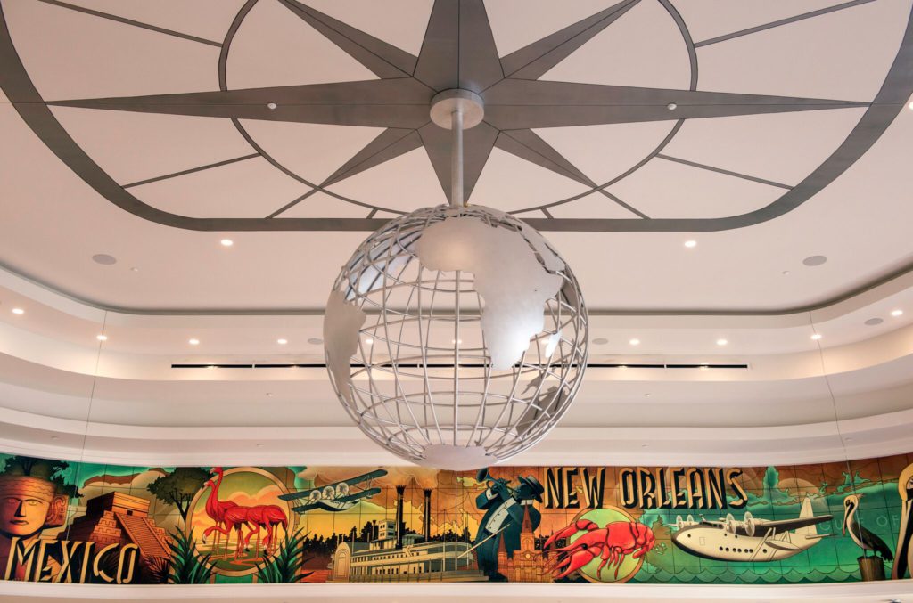 As with current air terminals, there is a first class lounge and Maria & Enzo's Ristorante. The First Class Lounge is a smaller private dining area, perfect for private events. Additionally, guests will be randomly selected for an "upgrade" and adults given a complimentary glass of Prosecco while the younger guests will be awarded flight wings. The icing on top of the cake that is Maria & Enzo's Ristorante has to be the globe hanging high above with a gold pin, making each of the Disney Parks and one special one marking Walt's hometown of Marceline, Missouri. Surrounding the ceiling is a geographically accurate mural, meaning if you are sitting in the dining room and you look up and see New York represented you are actually looking toward New York.