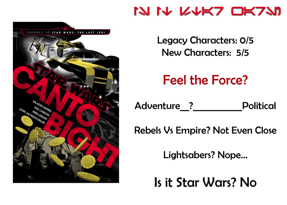 I credit Del Rey with going out on a limb with Canto Bight, but if I wanted quirky sci-fi, I’d just go read quirky sci-fi. When I pick up a Star Wars novel, you know what I want. We’ll never know for sure why Canto Bight had to pop-up in Episode VIII. I just wish that its novel form had done more to expand on the story of The Last Jedi rather than cash in on its fans' curiosity.