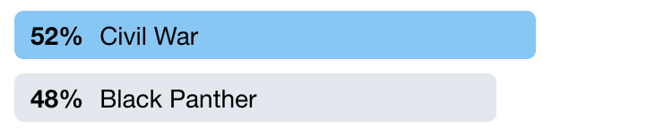 Yesterday's matchup between Captain America and Black Panther was our closest yet. Civil War barely inched ahead to claim the win. Keep voting to see what happens!