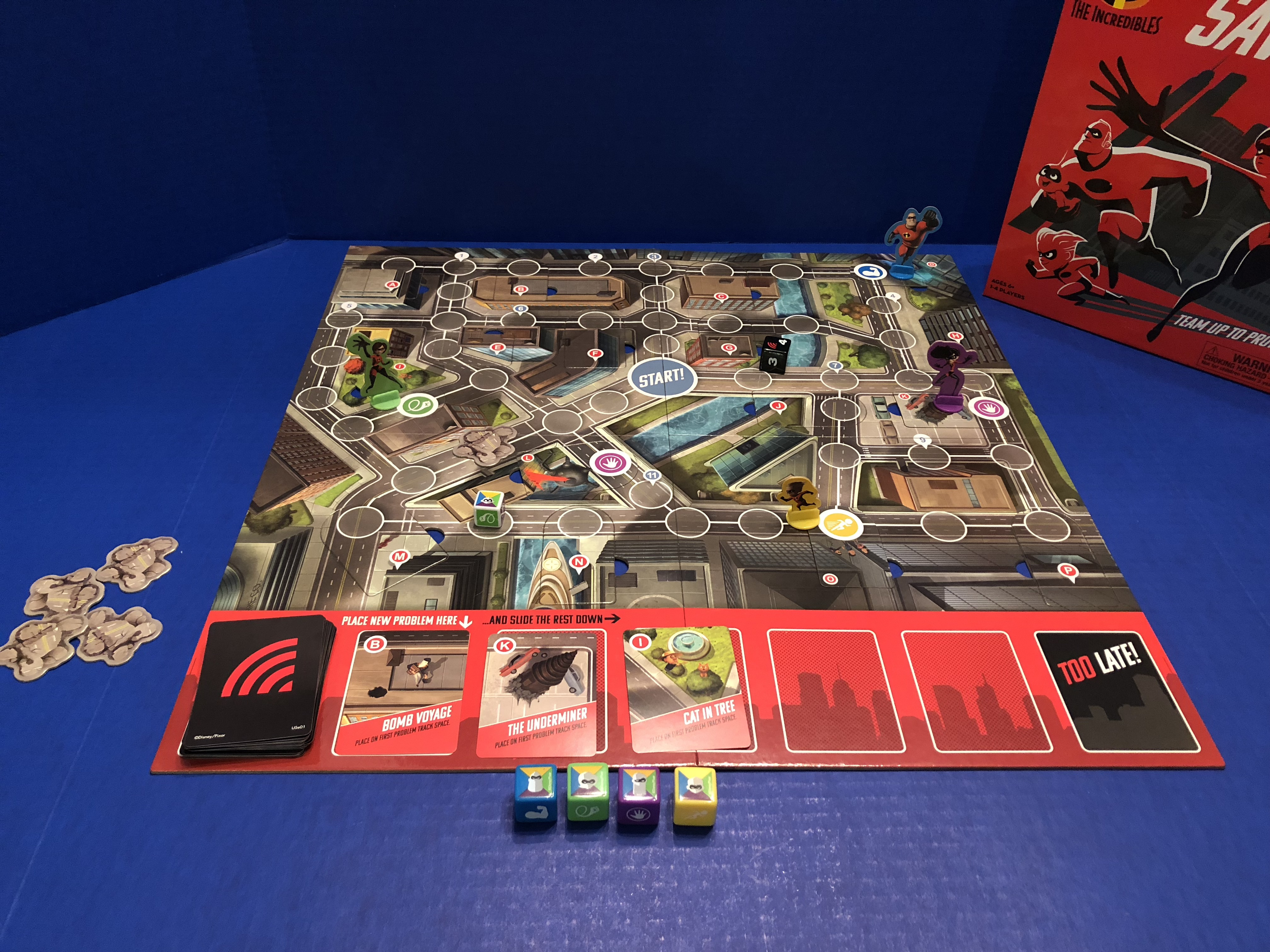 Of the six die that come with the game, one of them is the movement die, which each player rolls at the start of their turn. It reveals the maximum number of spaces they can move on their turn and if the number is accompanied by an alarm symbol, they must draw an alarm card. These can include assistance from other characters like Frozone or Edna, or they can put up road blocks that make it difficult to navigate the city (there are roadblock pawns that you place on the board following the instructions on the card). If you get a Problem Card, you add it to the bottom of the board and turn that space over. As problems on the board are solved, you turn the card over and Problem Cards keep moving down the line. The game is won by completing all of the problems before a face up card reaches the "Too Late!" space. If you reach that space, the game is lost by all players.