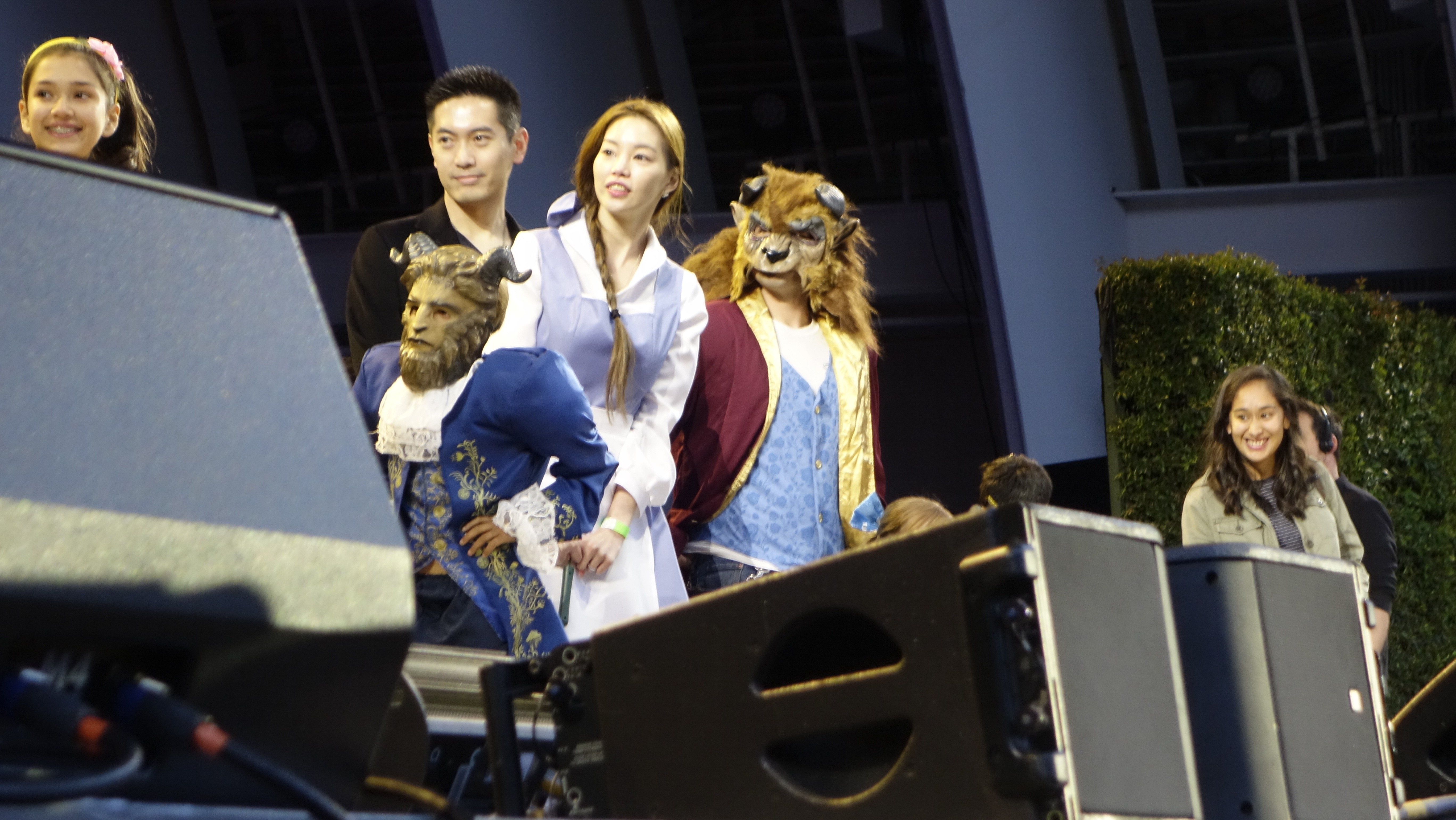 Zooey Deschanel appeared and sang "Belle." Everyone from DCappella was also part of the group numbers along with about a dozen other singers and performers. Dialogue scenes from the movie continued to play and then Taye Diggs was there singing as Gaston. After the song, everyone headed backstage and we watched more of the film, although it was slightly edited for time.
