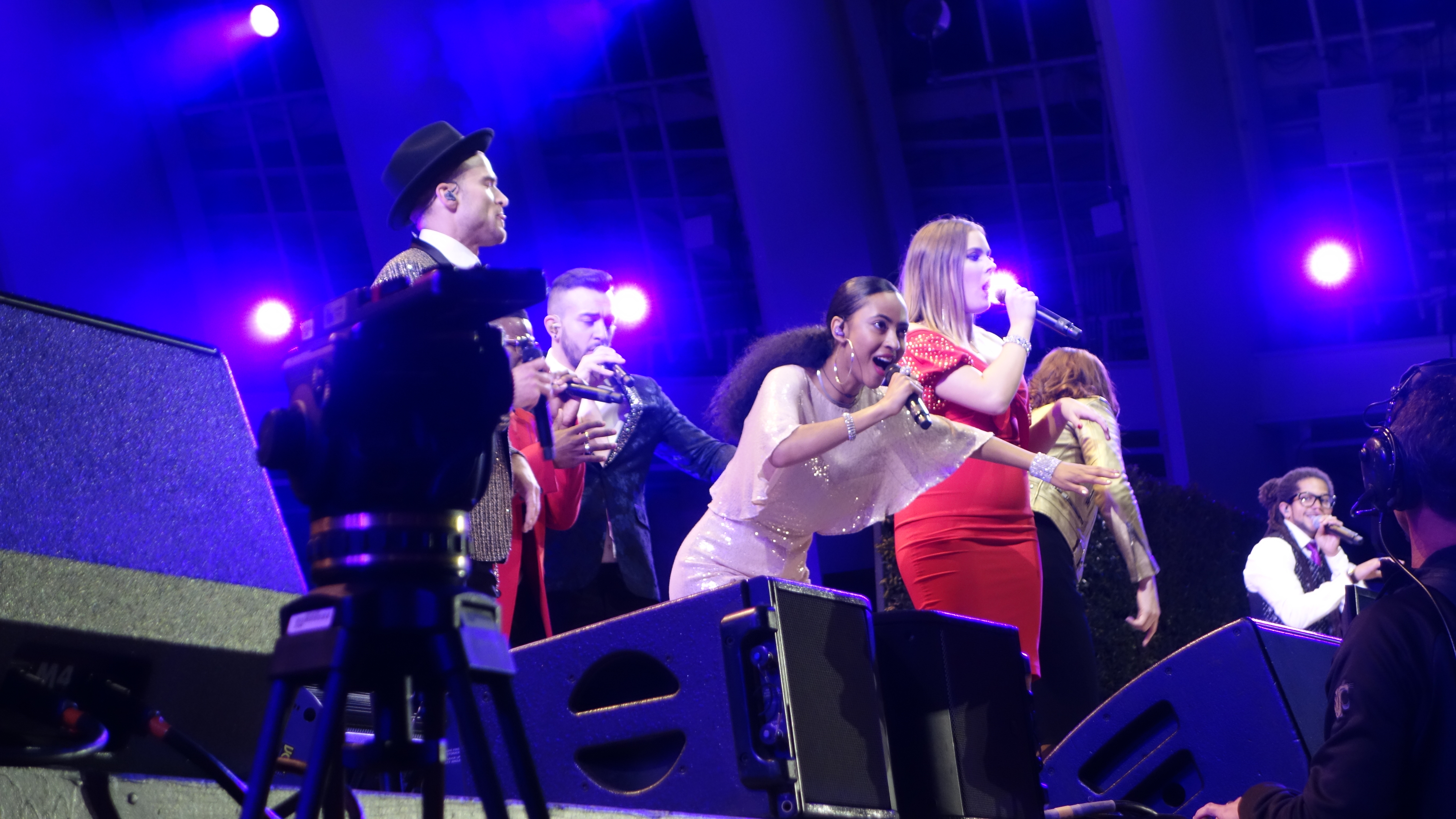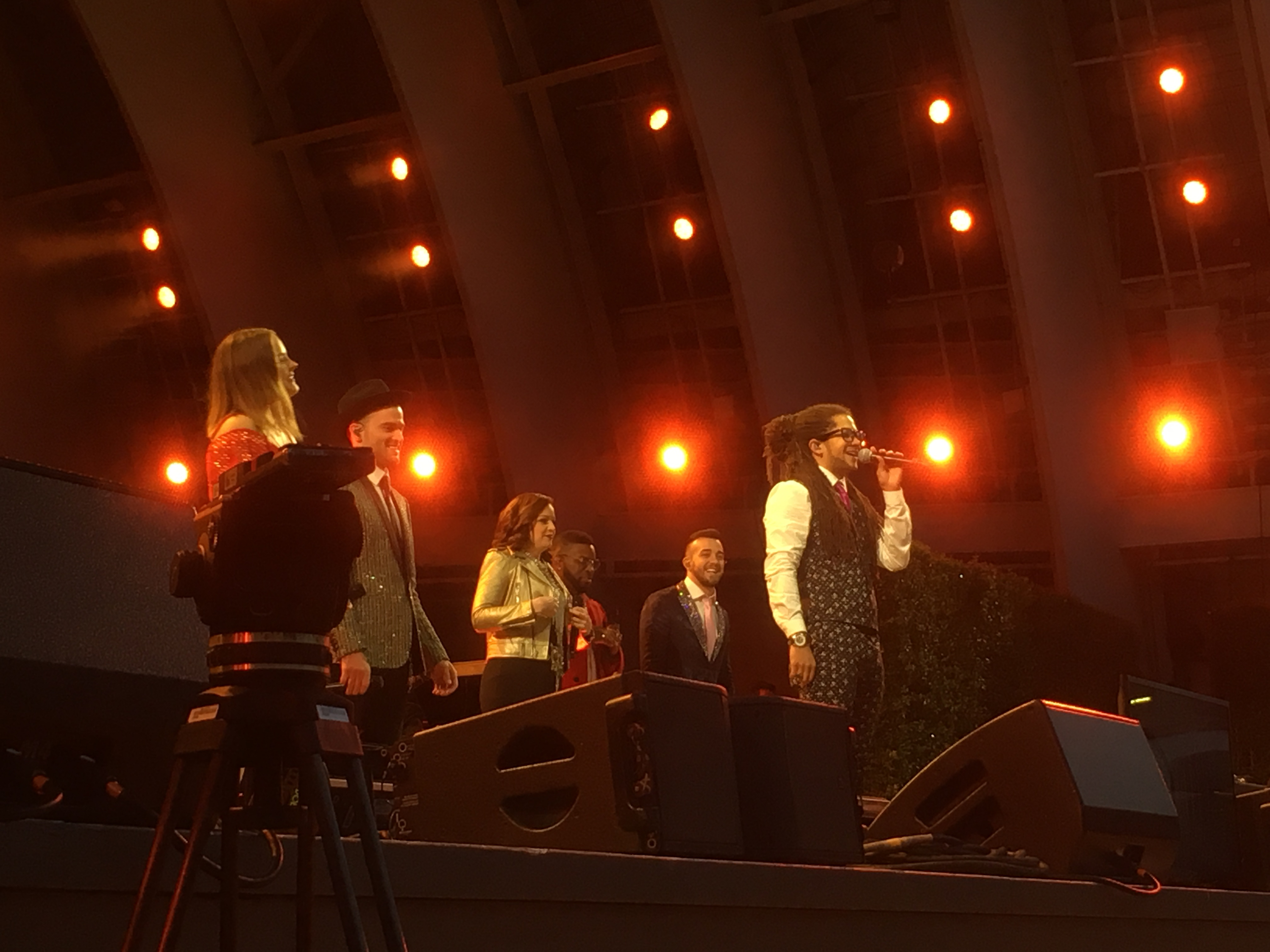 The next surprise of the night was the opening act. Disney's brand new group, DCappella took the stage to officially get things started. We'd seen their medley video, but this was even better. This also happened to be their first live performance and we were so glad to be a part of it. DCappella sang, hummed, and beatboxed (!) several favorite songs including:- "The World Es Mi Familia"