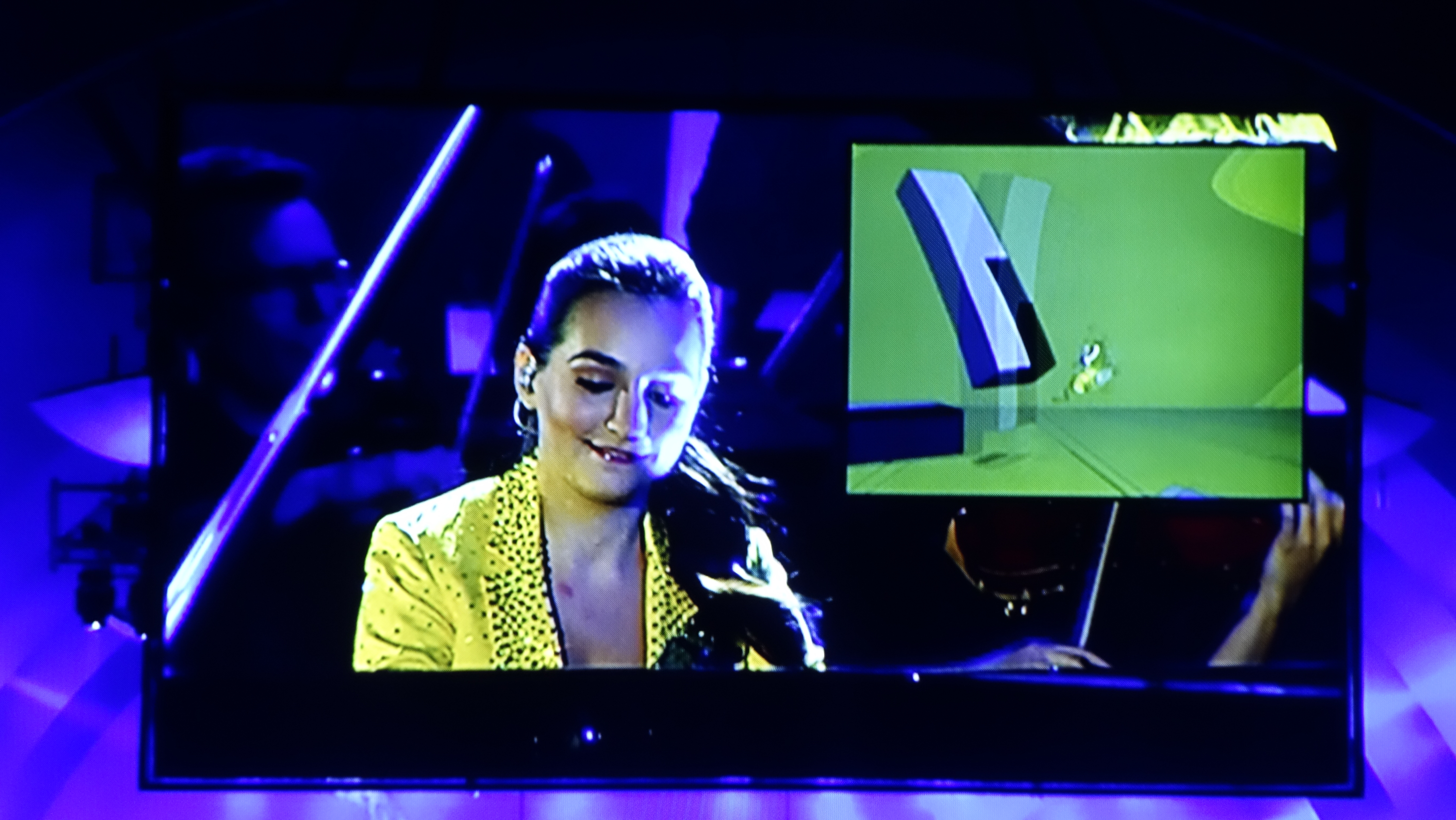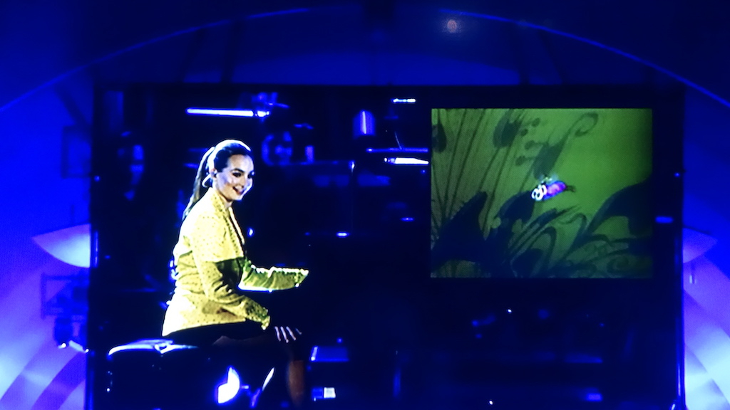 Ready for the next surprise? The amazing stage crew wheeled out a gorgeous grand piano for our next performer. Emily Bear is a 16-year-old piano prodigy and every bit deserving of that title. She provided the piano music for the Disney animated short, Bumble Boogie while the audience watched the animated clip. The orchestra also played, but Emily was the star!Act I