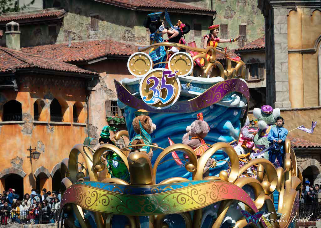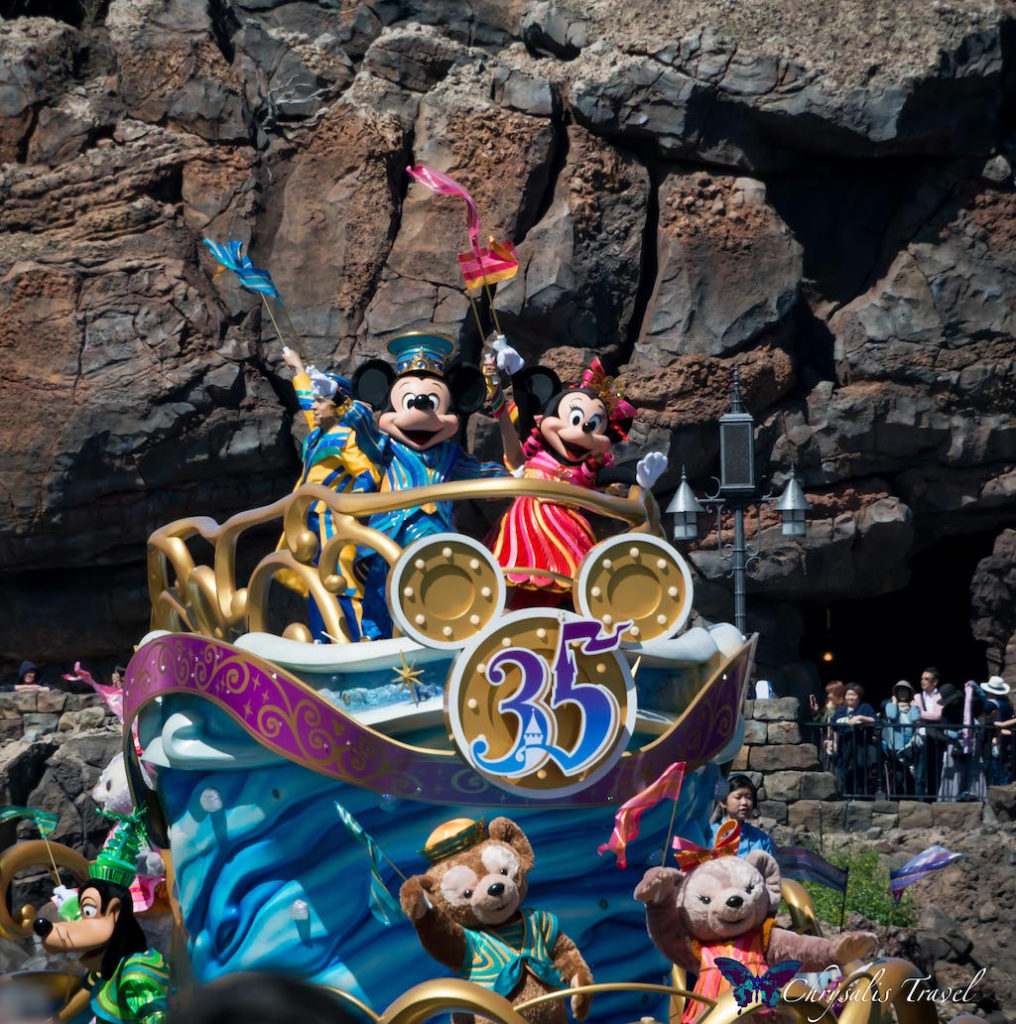 Tokyo DisneySea is celebrating the 35th Anniversary of the Tokyo Disney Resort. The “Happiest Celebration on the Sea” parade features Mickey and friends on one float that circles Mediterranean Harbor.