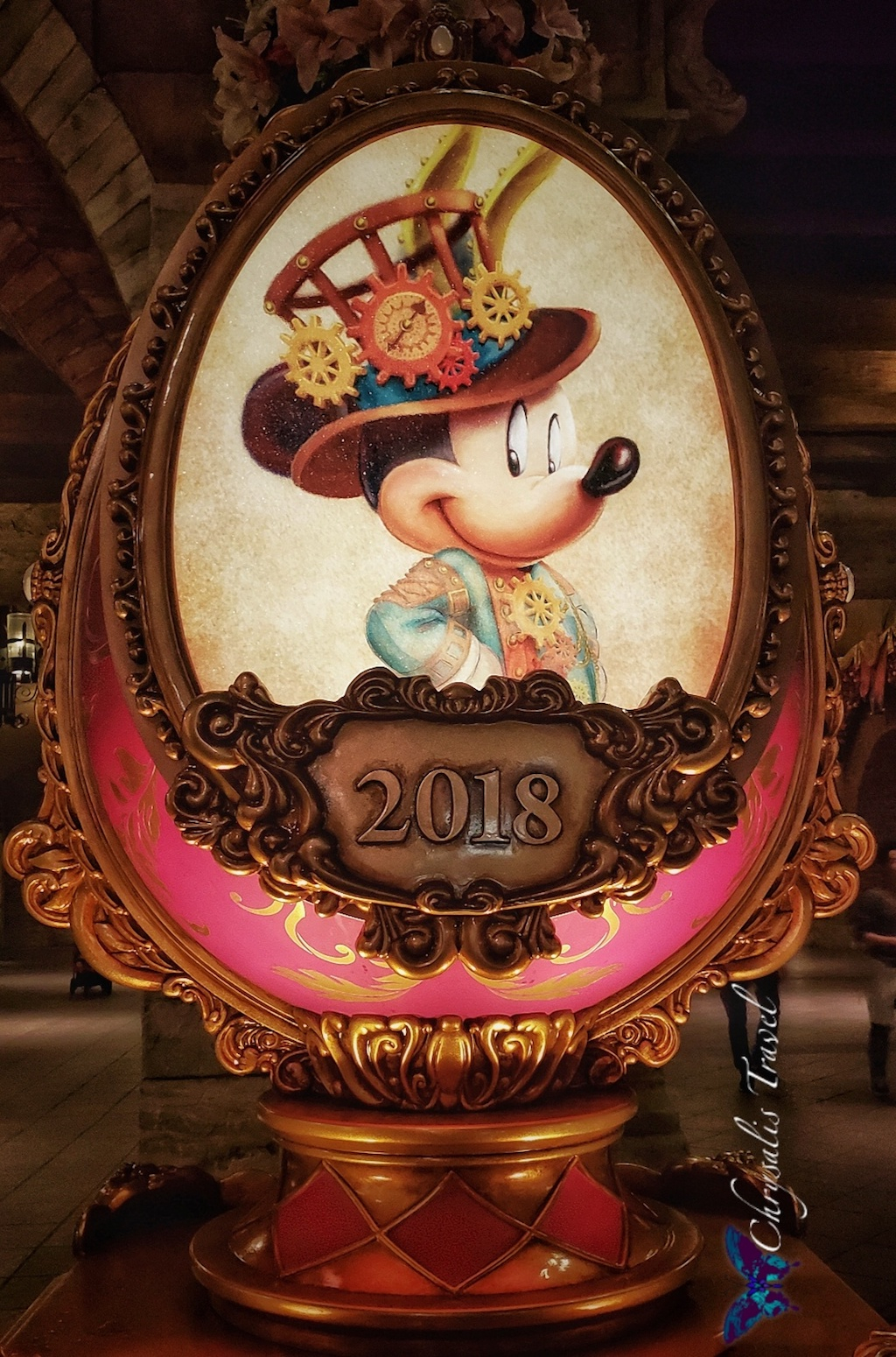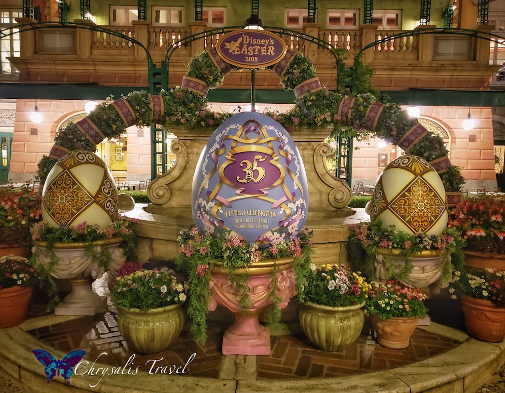 Throughout the Park, there were so many decorations custom-branded with both 35th Anniversary and Easter. “Disney’s Easter 2018” decorated the entry portal with flanking 35th “Happiest Celebration” medallions and banners. Travel tip: for a less crowded experience, go on a rainy weekday.Guests loved taking pictures with this grand egg display in Mediterranean Harbor. “Fashionable Easter” is the theme at Tokyo DisneySea. This special Easter egg commemorates the event.