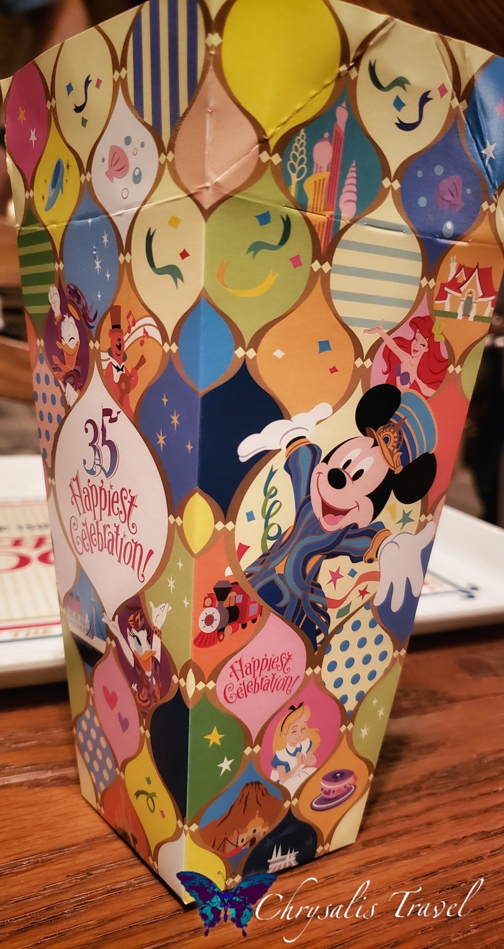 Here is the 35th “Happiest Celebration” popcorn box. Notice the perforations at the top. You can fold the box down and seal it, thus preserving your popcorn during rides. Genius. The 35th Anniversary Mickey popcorn bucket is pictured above in the ‘Today’ Guide photo.