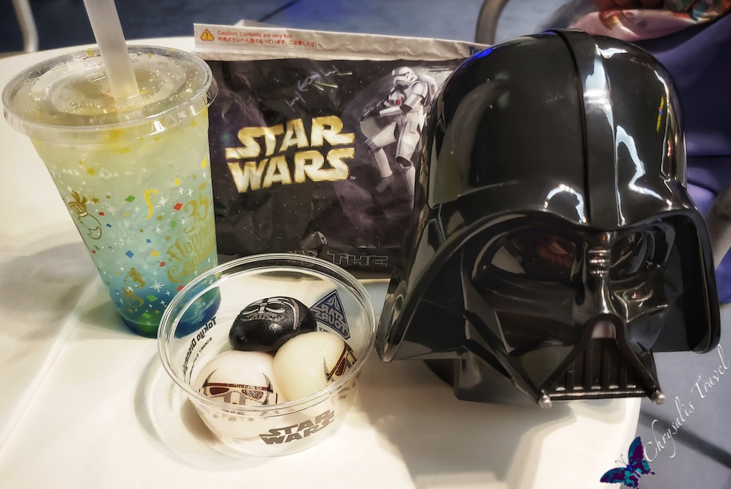 For all the Star Wars fans out there: Tokyo Disneyland has stepped up their game. In Tomorrowland, you can now find Star Wars mochi ice cream. Like the popular Green Alien mochis, these come in a set of three with an optional Darth Vader carrying case.Pair that with a Dark Side chicken calzone – the shell is literally black – and a 35th ‘special’ bubbly blue soda with candies at the bottom, and you have a great meal.