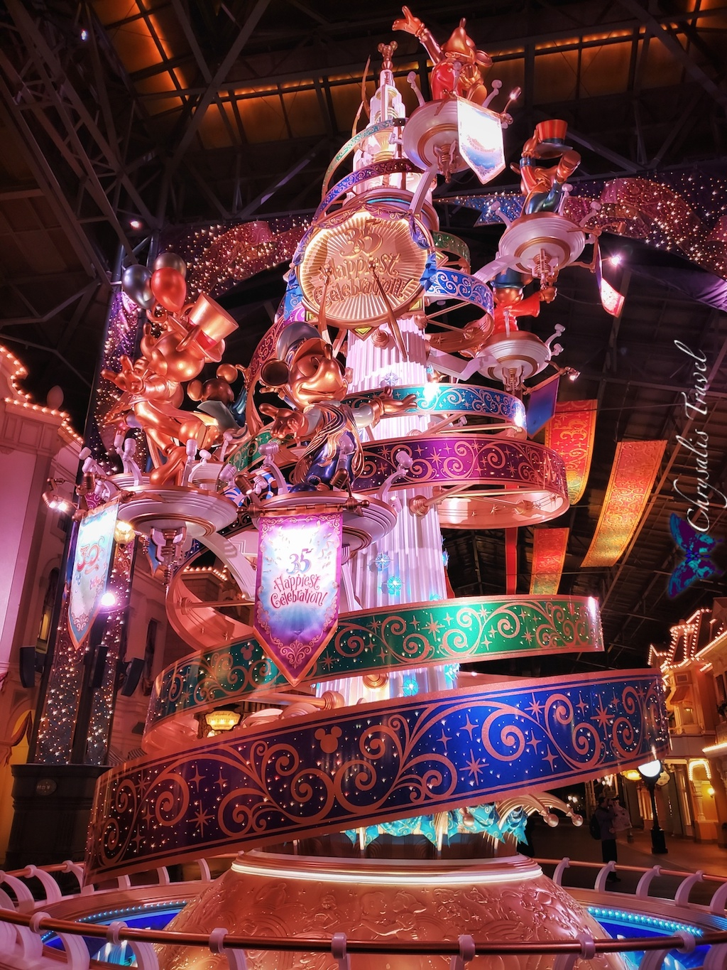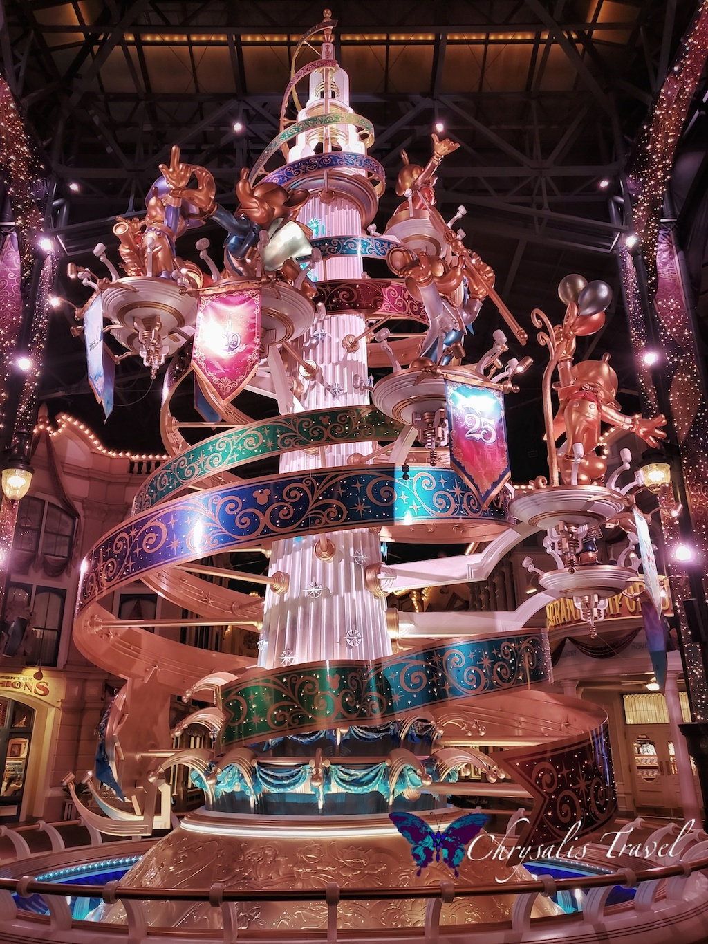 One of the things I love most about Tokyo Disney Resort is that they go ‘all out’ in decorating for each season. Whether it’s Easter, Halloween, Christmas, or their Anniversary – everything is perfectly themed from the moment you enter the Parks. Mickey and his pals really rolled out the red carpet for guests this year.Disney magic decked the halls of the Grand Bazaar. The centerpiece is a massive ribbon tree with golden Mickey mascots from anniversaries past. It’s quite a spectacle as you walk around, as the view changes constantly.