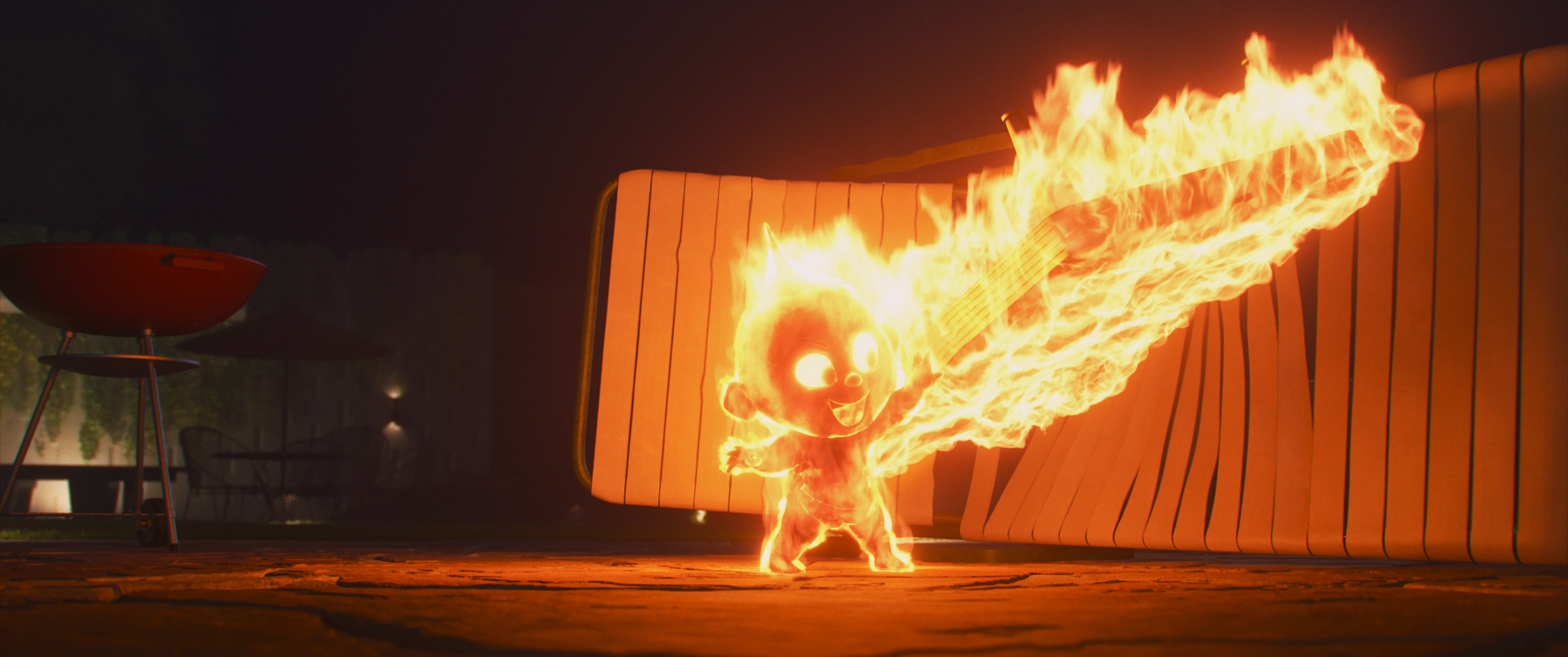 In addition to Jack-Jack’s design becoming more lifelike, the effects department took the opportunity to redesign some of his powers, not counting the new ones. Effects Artist Jason Johnston shares some examples about the fire effect. “When we first started on the effect, we went back to look at what was done originally. After looking at the original, we decided to take the opportunity to redesign the look. The reason being that while on fire, his role would be bigger in Incredibles 2 and it would have more screen time. And we would need to read his animation, especially in his face, and also because technology has changed so much.”